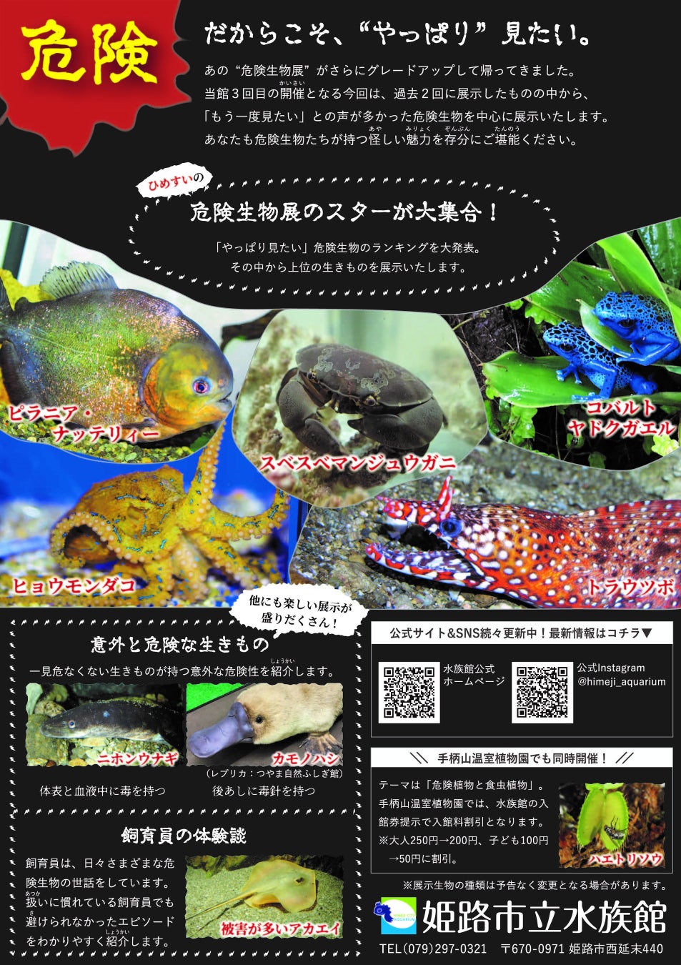 生きものの中には、毒があったり、咬みついたりするなど危険な性質を持つ生きものがいますが、本企画展では、過去2回(2018年・2022年)の危険生物展で来館者の反響の大きかった危険生物を中心に展示します。併せて、身近な危険生物の対処方法や意外な危険生物も紹介します。なお今回は、手柄山温室植物園と同時開催することで危険な植物についても植物園にて紹介される予定です。
