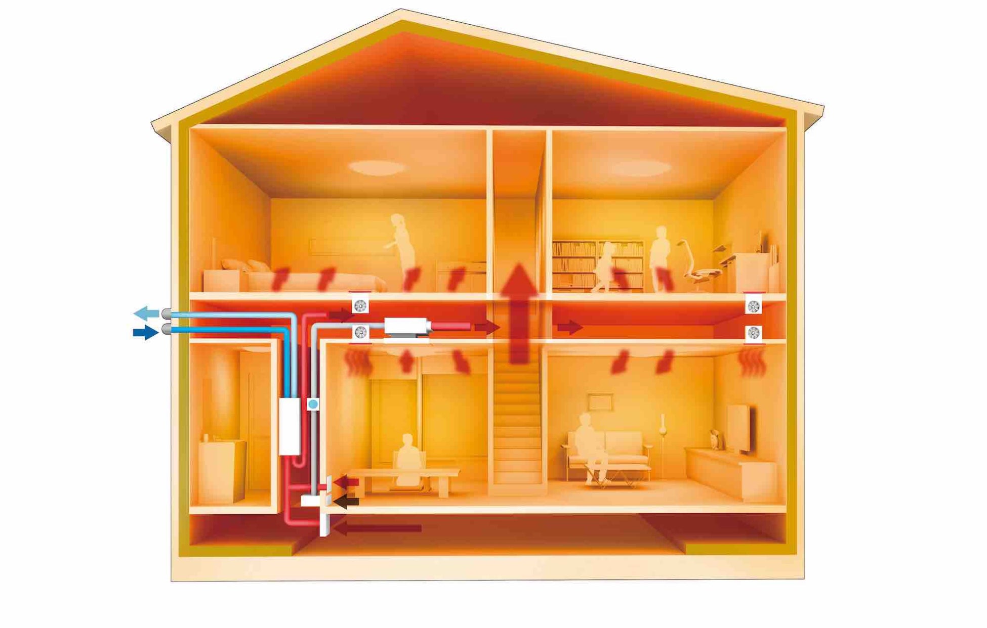 ▶️ 1階と2階の間の空間(階間)を空調・換気のチャンバーとして利用することでダクトレスを実現し、施工性・メンテナンス性を向上します。
