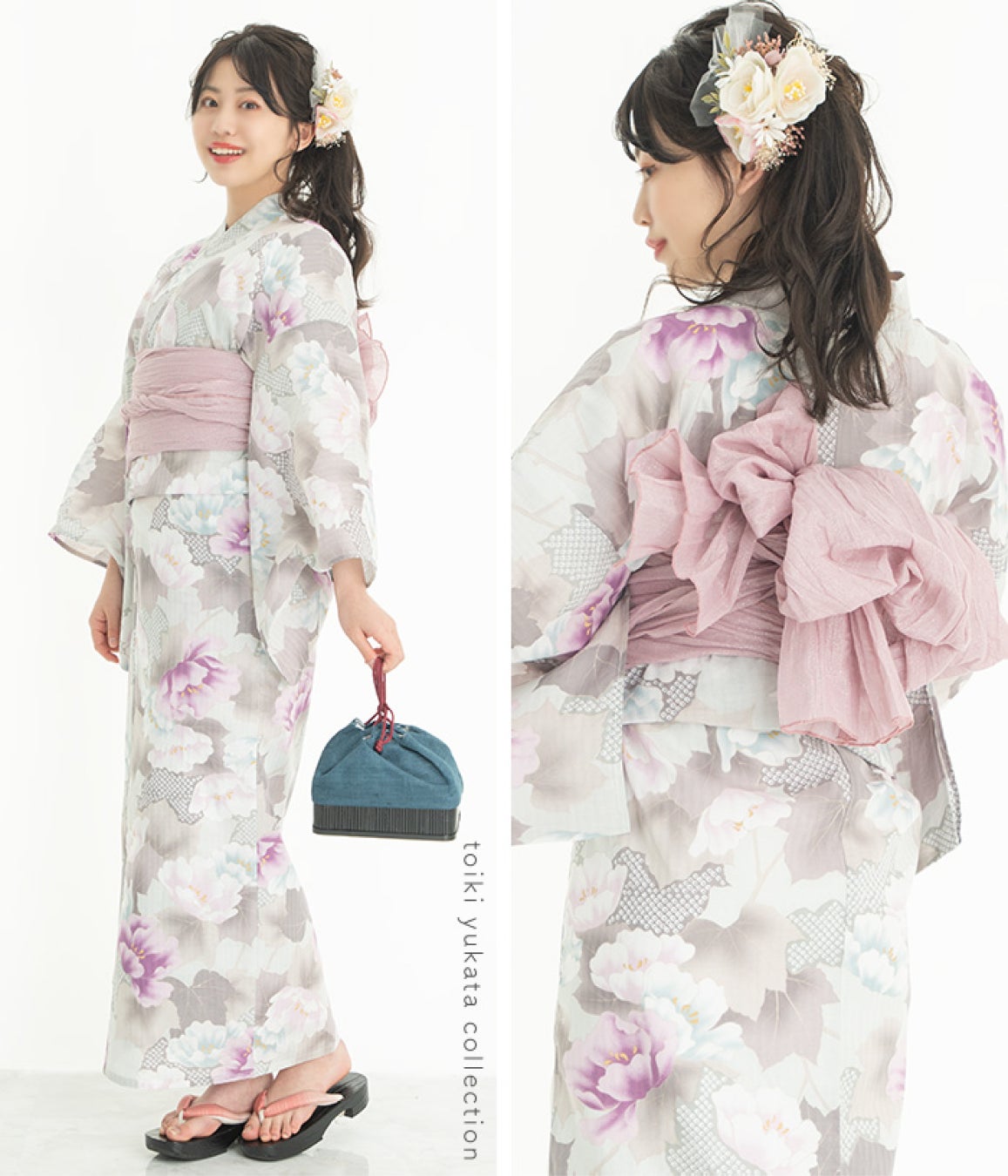 浴衣単品はもちろん、浴衣・帯の2点セットも販売しております。セットの帯は、アレンジが簡単な大人可愛い兵児帯と、結び方で印象が変わるリバーシブル半幅帯のどちらかを色柄に合わせてご用意致しました。