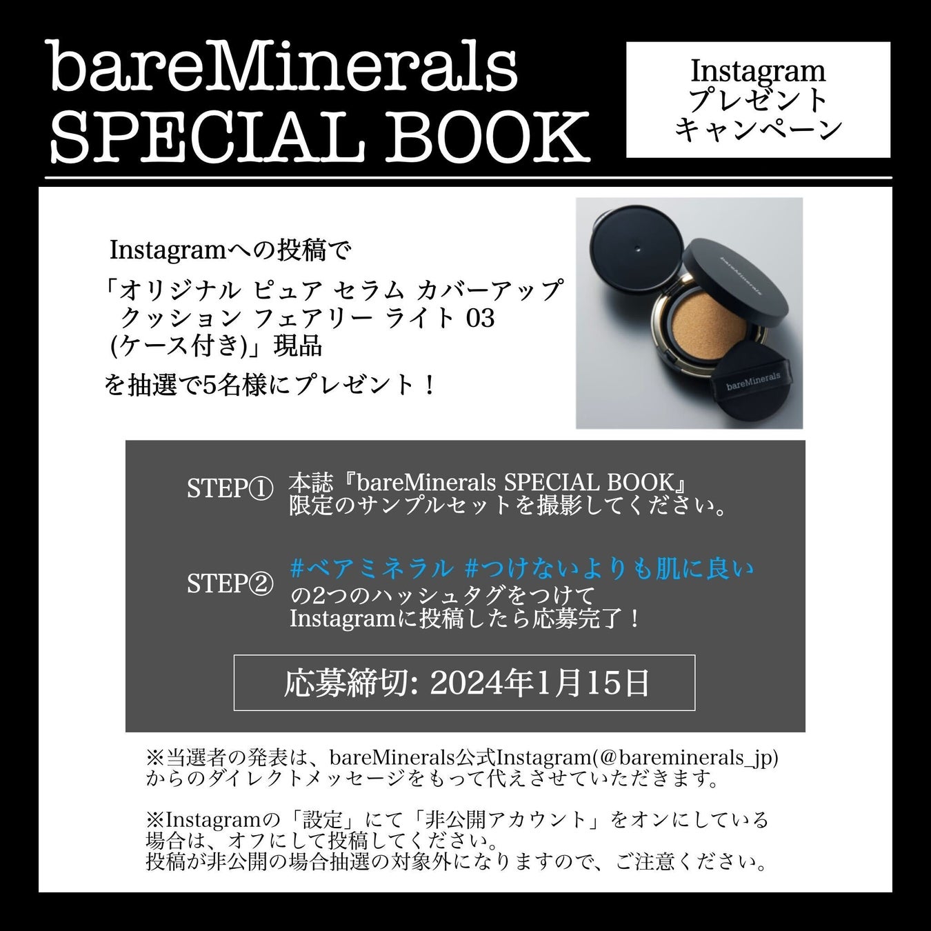 ※当選者の発表は、bareMinerals公式Instagram(@bareminerals_jp)からのダイレクトメッセージをもって代えさせていただきます。
