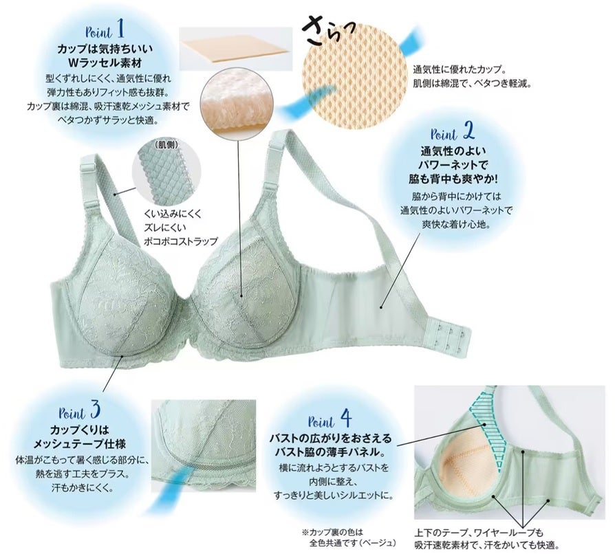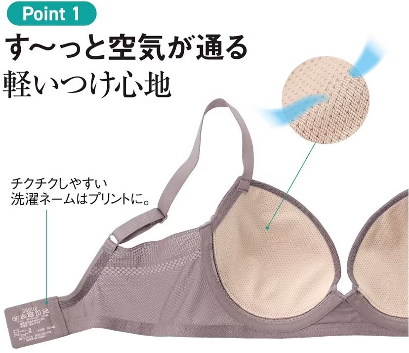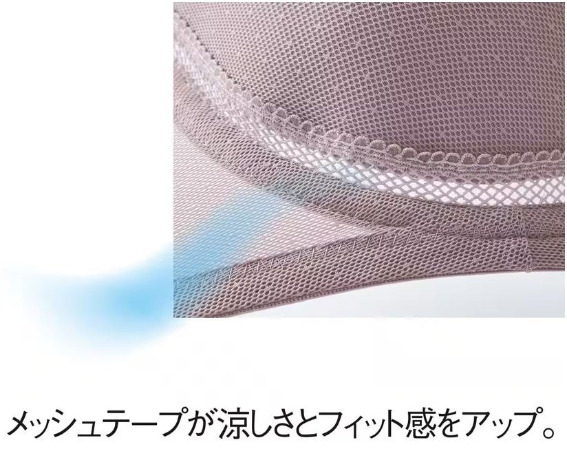 熱がこもりやすいカップくり部分は、メッシュテープ仕様。カップ肌側とストラップ、下辺テープ部分にも吸汗速乾素材を使用。