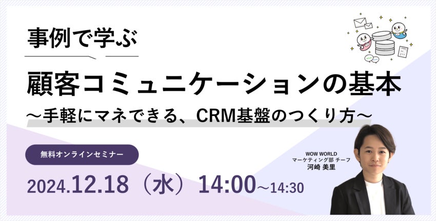 コミュニケーションシステム「WEBCAS(ウェブキャス)」とエンゲージメントソリューション「WOW engage(ワオエンゲージ)」を提供する株式会社WOW WORLD(ワオワールド/本社:東京都品川区、代表取締役社長:美濃 和男、以下、当社)は、「事例で学ぶ顧客コミュニケーションの基本 ~手軽にマネできる、CRM基盤のつくり方~」と題した無料オンラインセミナーを、2024年12月18日(水)に開催いたします。本セミナーでは当社のユーザー企業様の事例をもとに、手軽にCRM基盤をつくる方法を具体的にご紹介いたします。