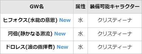 新たにクリスティーナ専用のスペシャルグランウェポン(SGW)「水龍の意思 ヒフォクス」、「静かなる激流 河伯」、「波の指揮者 ドロレス」の3種が追加されました!