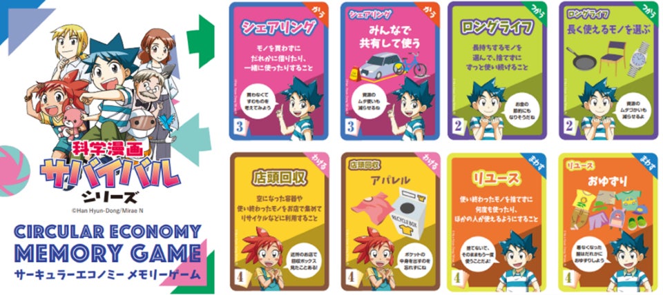 小学生に大人気の「科学漫画サバイバル」シリーズとコラボレーションし、特別に書き下ろされたオリジナル漫画「サーキュラーエコノミーのサバイバル」と、オリジナルカードゲームを通して、サーキュラーエコノミーを体験しながら楽しく学ぶことができます。また、大阪・関西万博で開催した「サーキュラーエコノミー研究所」で好評だった展示の一部を体験することもできます。さらに、「サーキュラーエコノミーのがっこう」に参加していただいた皆様には、授業で使用したオリジナル漫画とカードゲームをお持ち帰りいただけます。