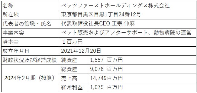 対象会社であるペッツファーストHDはペッツファースト株式会社(2008年4月設立)等の7社を傘下にペット販売からアフターサポート・動物病院・ペット保険等のペットの生涯に寄り添う、ペットの総合企業を目指し、104拠点のペット販売店及び動物病院等を展開しております。