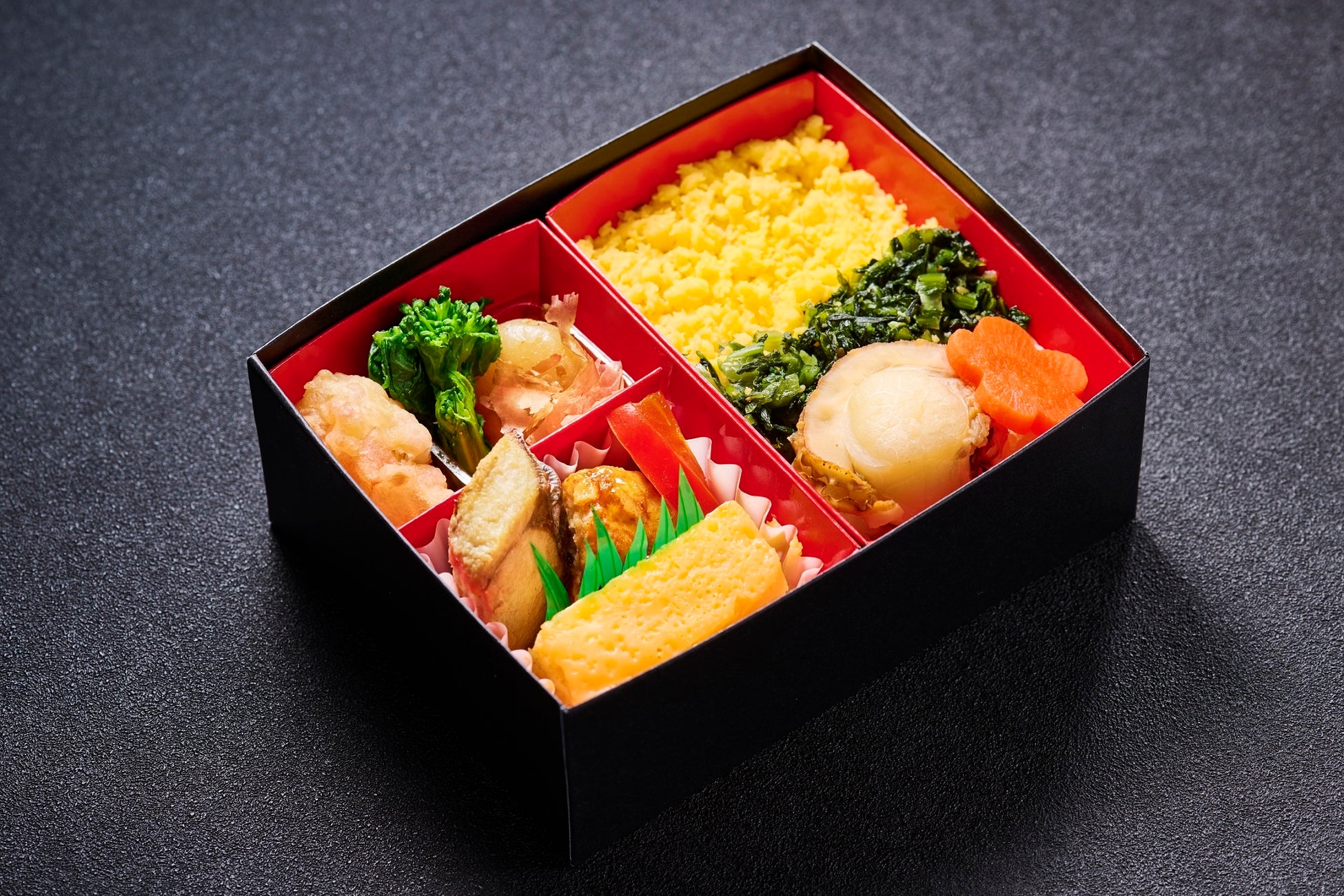 ・えび生姜風味 ・菜の花 ・玉蒟蒻おかか和え ・さわら利久焼き ・軟骨入り鶏つくね ・赤パプリカ