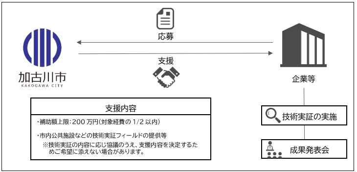 ■市の支援:市内公共施設などの技術実証の機会提供、技術実証モニターの募集支援、技術実証のPRなど ※技術実証の内容に応じ、協議のうえ、支援内容を決定します。