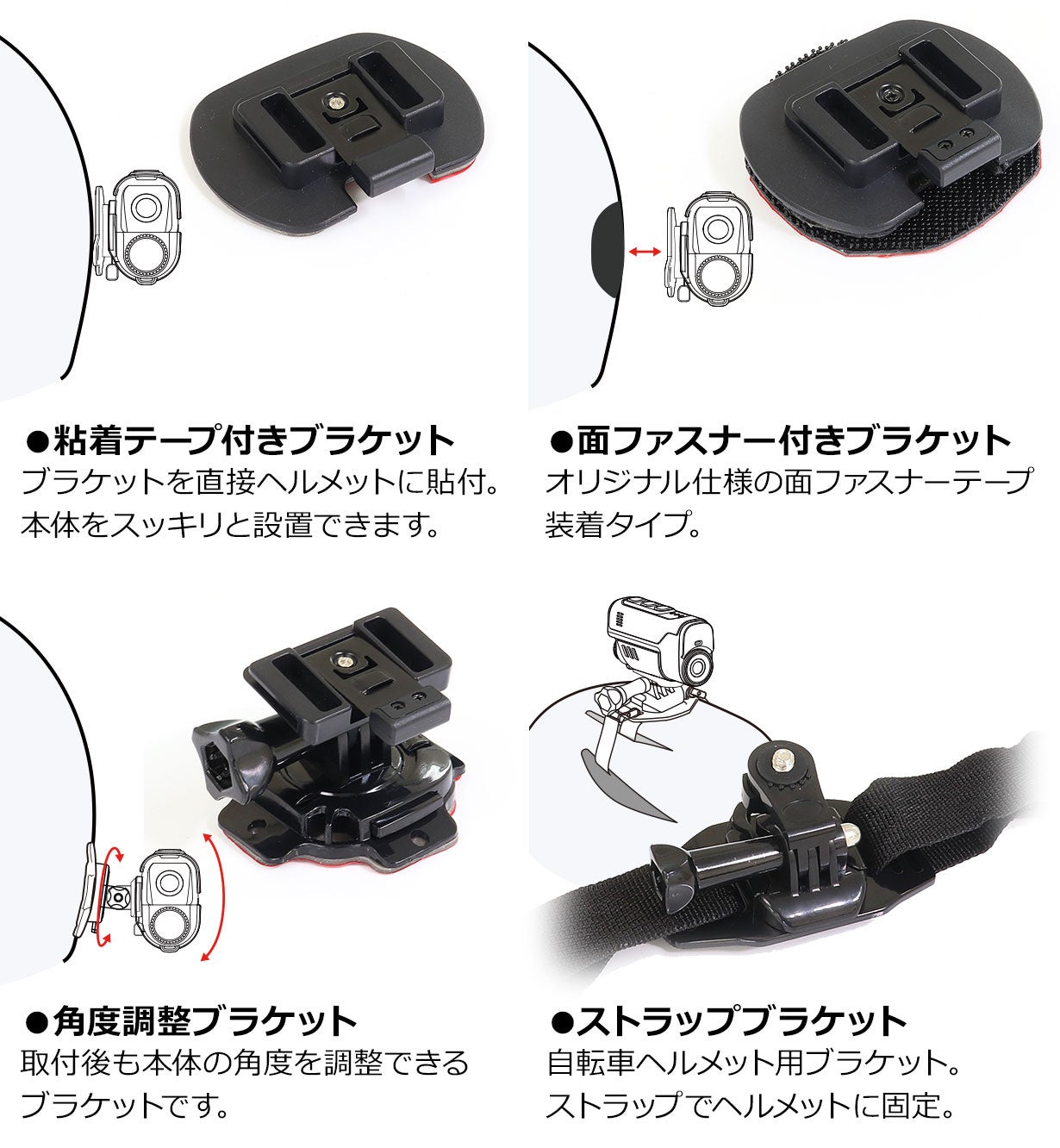 バイク用や自転車用の様々な専用ヘルメットにも対応できるよう各種取り付けステーが標準装備。