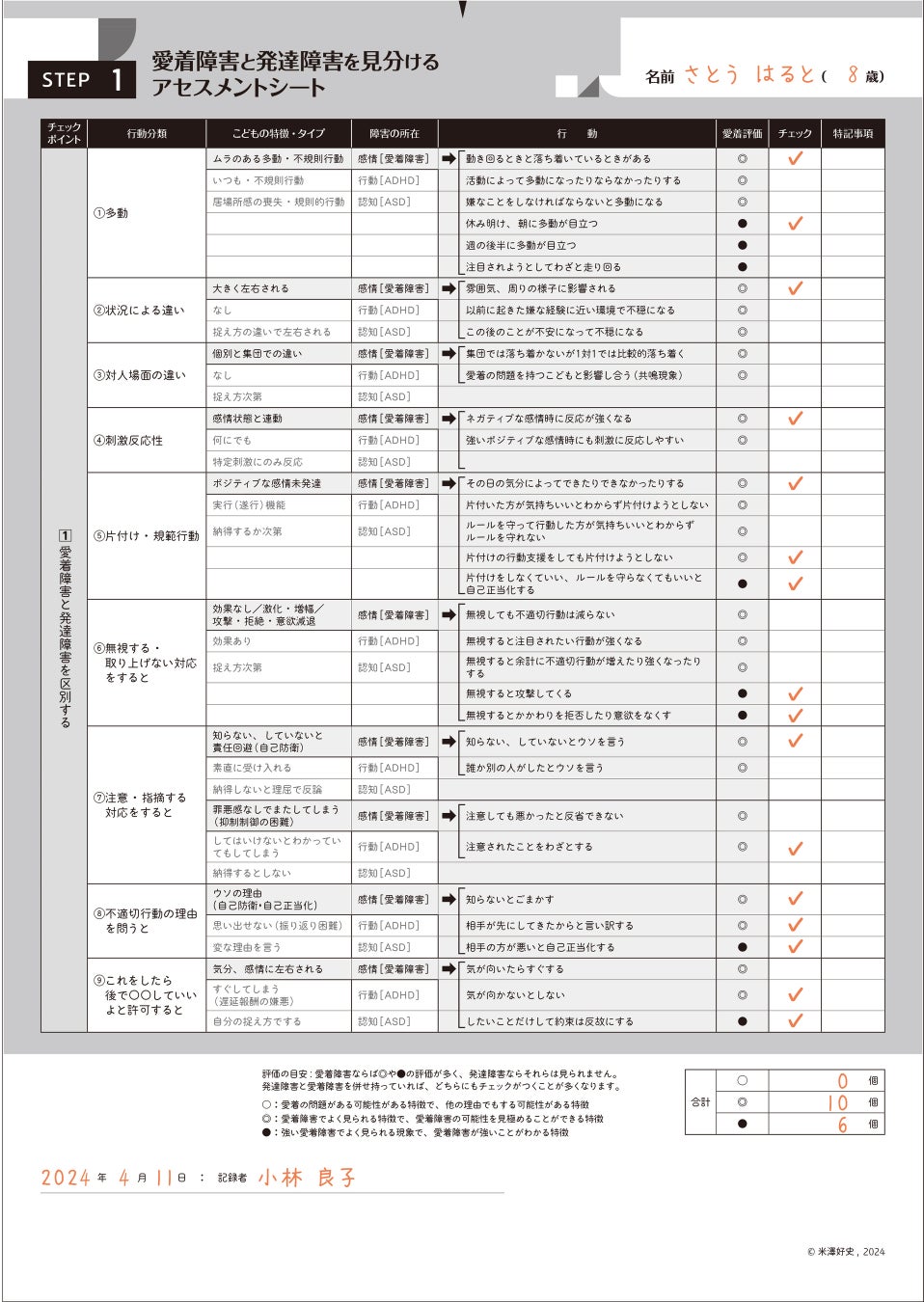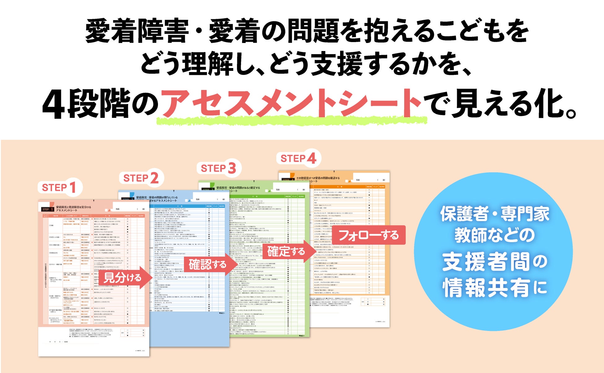 愛着障害・愛着の問題を抱えるこどもをどう理解し、どう支援するかを、4段階のアセスメントシートで見える化。アセスメント結果に応じた、適切な支援・具体的なかかわり方を明示しています。保護者、専門家・教師などの支援者間の情報共有に、ぜひお役立てください。