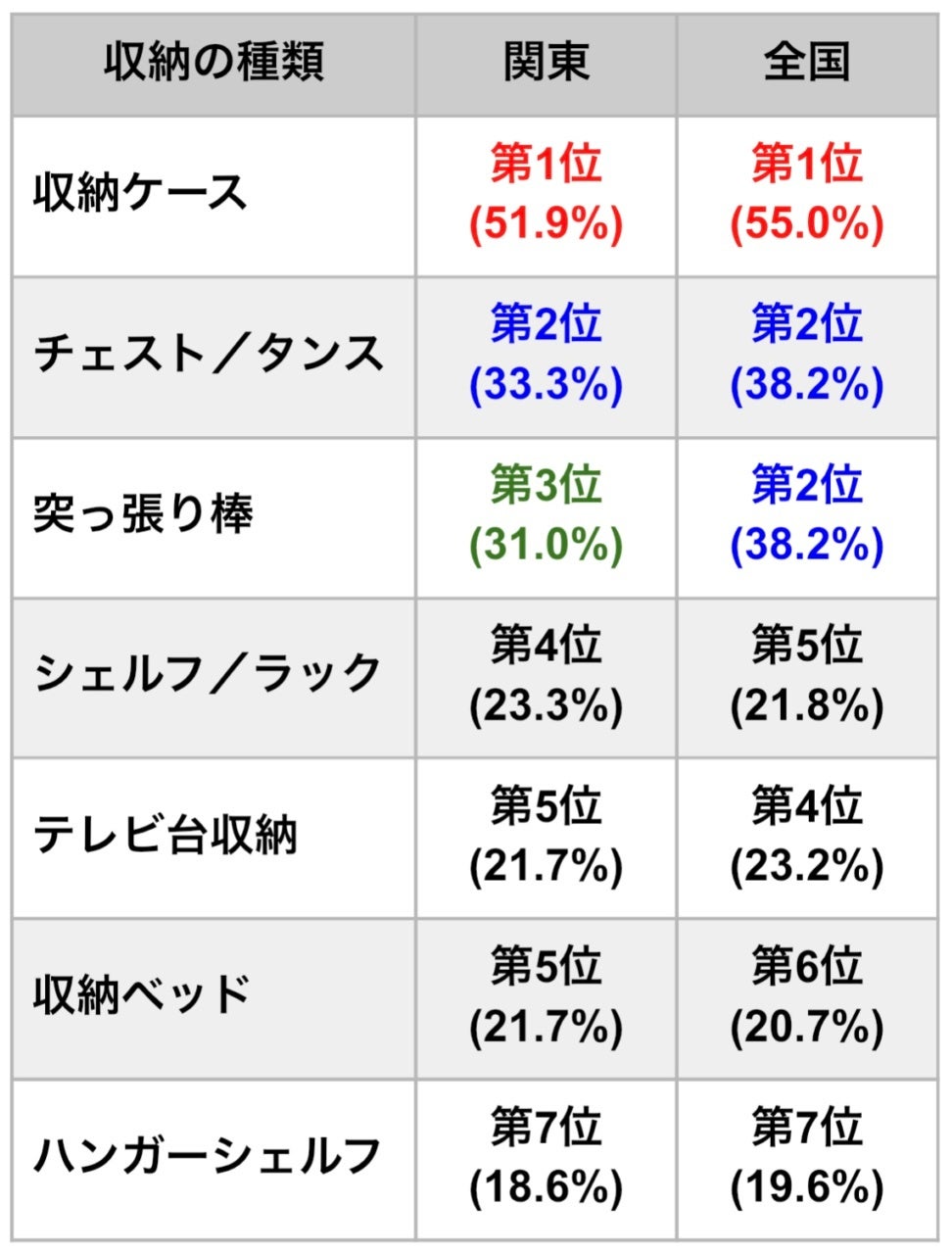 また、収納棚を増やして収納量を増やす「チェスト/タンス」、ハンガーをかけたり壁棚を増やす「突っ張り棒」がそれぞれ3割台で、関東では4割近い割合でした。
