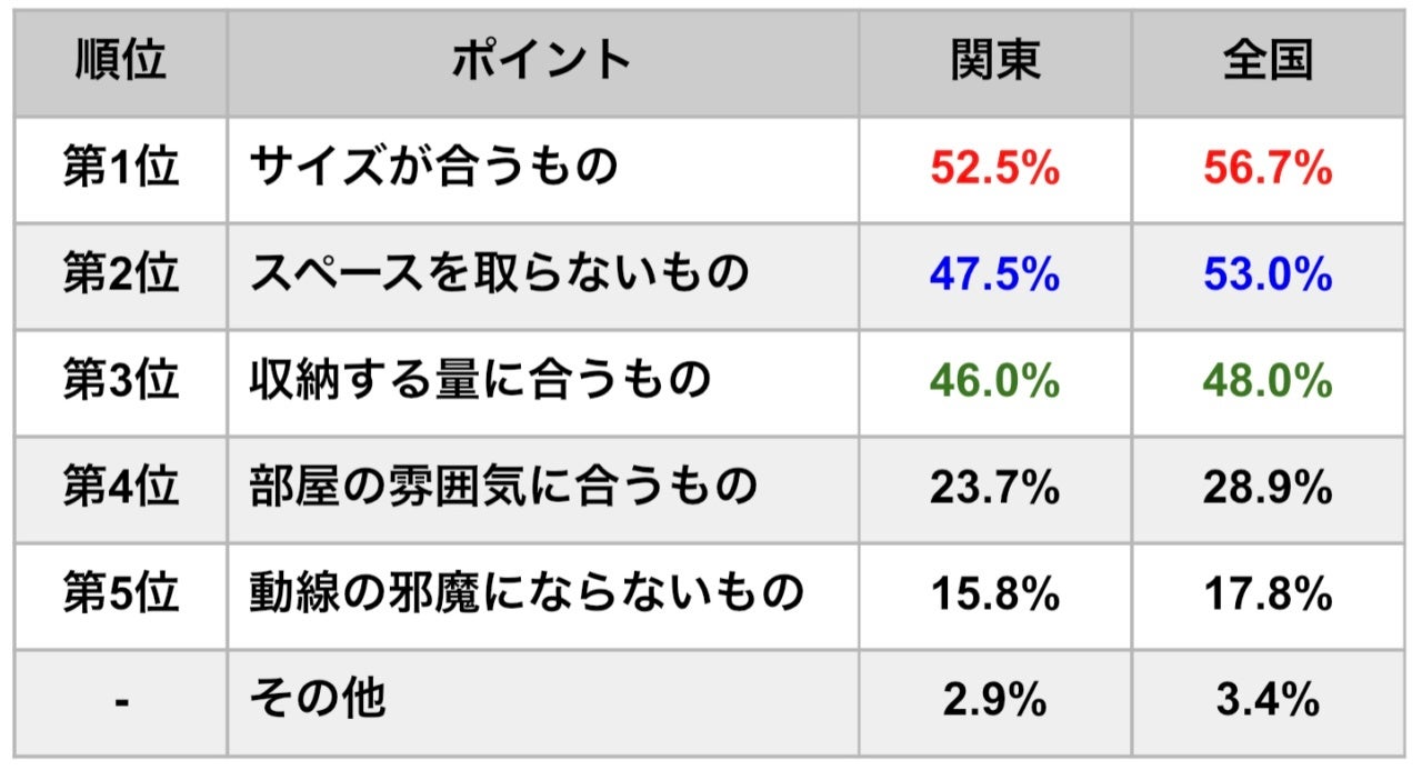 上位3つはサイズ感を重視するポイントが並び、続いて「部屋の雰囲気に合うもの」が2割台、「動線の邪魔にならないもの」が1割台でした。