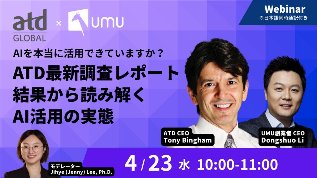 ユームテクノロジージャパン株式会社(本社:東京都新宿区、代表取締役:松田しゅう平、https://www.umujapan.co.jp、以下 ユームテクノロジージャパン)は、世界最高峰の人材育成の国際カンファレンス「ATD International Conference & Exposition」の会長兼CEO Tony Bingham(トニー・ビンガム)氏とUMU創業者兼CEO、元GoogleトップマネージャーであるDongshuo Li(ドングショー・リー)が解説する「AIを本当に活用できていますか? 〜ATD最新調査レポート結果から読み解くAI活用の実態〜」と題するオンラインセミナーを、2025年4月23日(水)10:00〜より開催いたします。