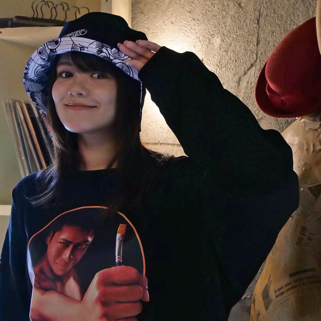 某映画を思わせる古着風デザインのビッグロングTシャツと、愛犬ケイピーの柄をあしらったリバーシブルハットの2種を展開。