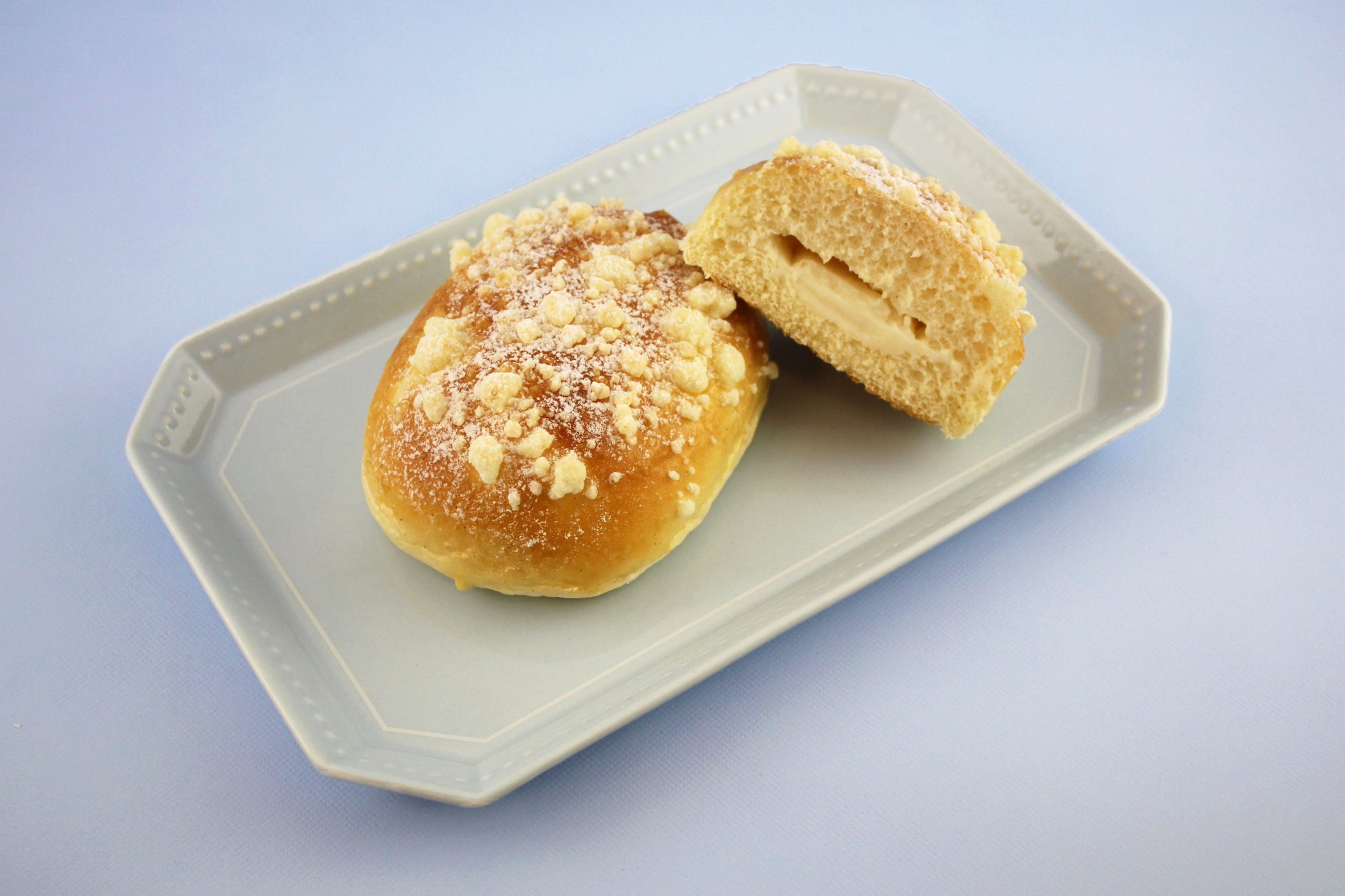 バニラクリームをふんわりやわらかい菓子パン生地に包み、クランブルとフルール・ド・セル(塩)をトッピングして焼き上げました。夏にぴったりな爽やかな甘みで、冷やすとより一層美味しくお召し上がりいただけます。