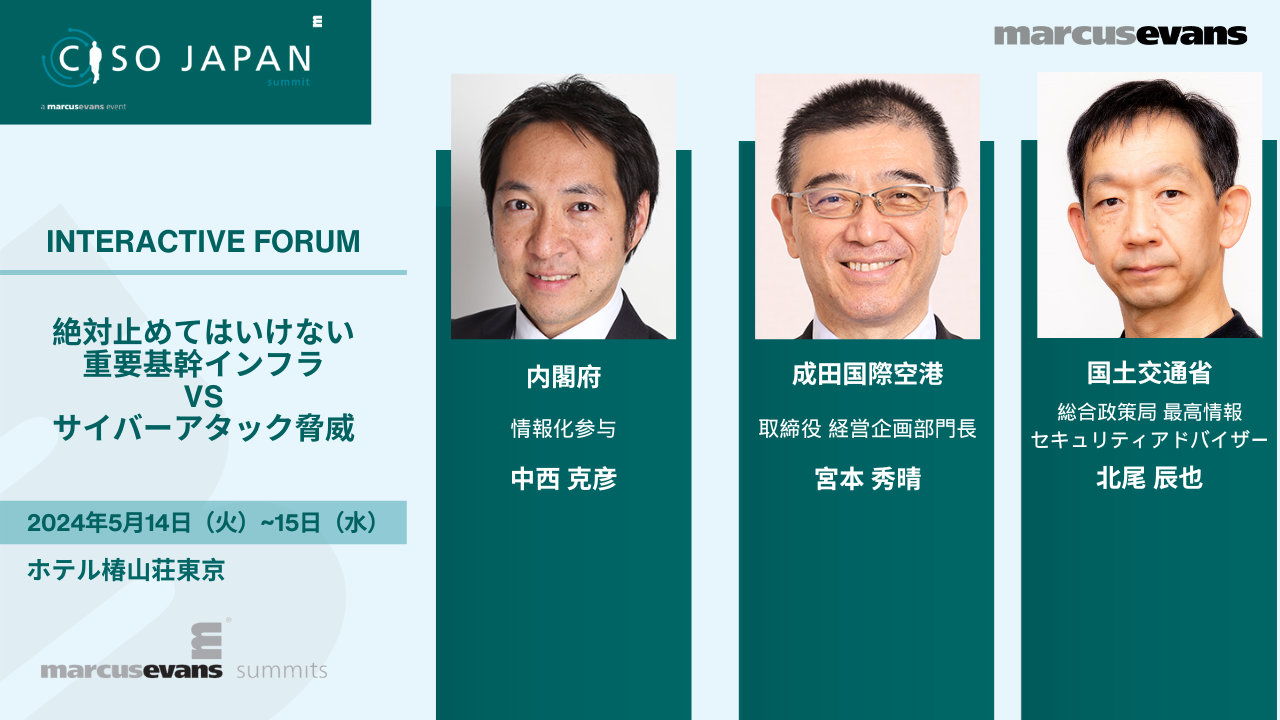 内閣府の中西 克彦氏、成田国際空港株式会社の宮本 秀晴氏、国土交通省の北尾 辰也氏をお迎えして、重要基幹インフラVSサイバーアタック脅威についてお話しいただきます。