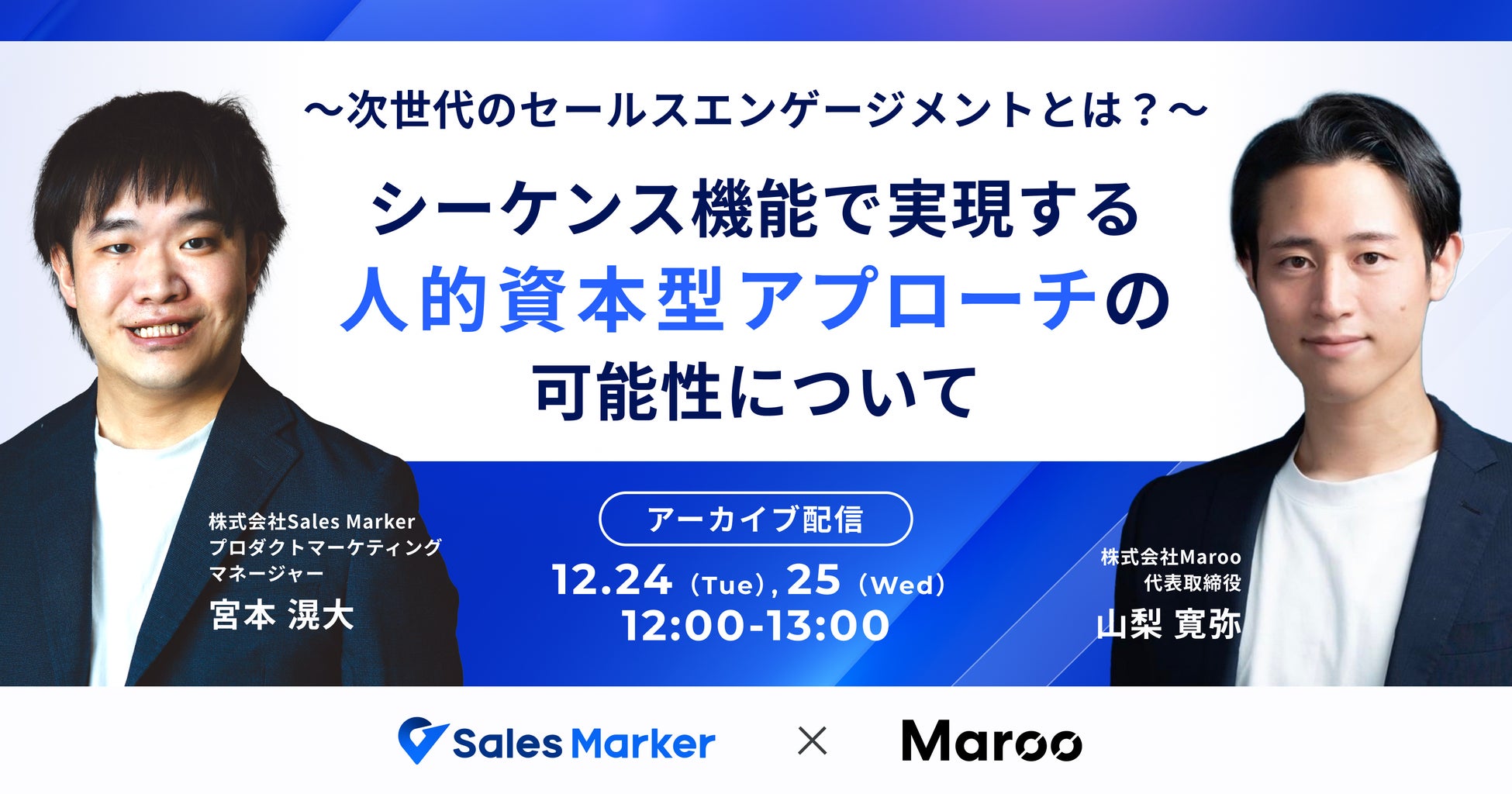 国内初※1のインテントセールスSaaS『Sales Marker(セールスマーカー)』を開発・提供する株式会社Sales Marker(本社:東京都渋谷区、代表取締役CEO:小笠原 羽恭、以下:当社)は、次世代のセールスエンゲージメントの鍵を握る「シーケンス機能」をテーマとしたウェビナーのアーカイブ動画を、2024年12月24日(火)・25日(水)に配信いたします。