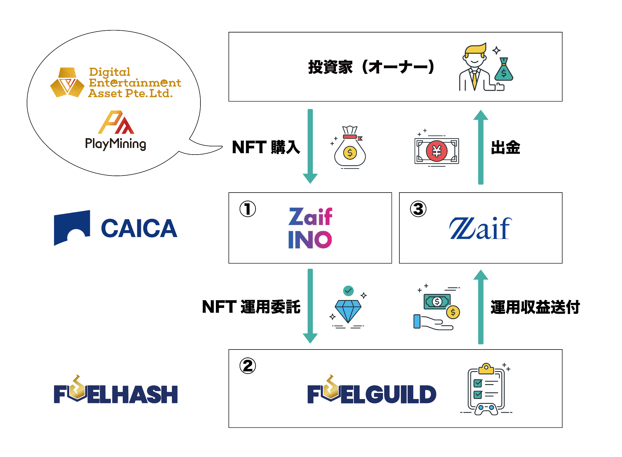 株式会社CAICA DIGITAL(本社︓東京都港区、代表取締役社長︓鈴木 伸、以下「当社」)は、暗号資産による資産運用プラットフォームを提供する株式会社FUELHASH(本社:東京都千代⽥区、代表取締役:紺野 勝弥、以下「FUELHASH」)及びDigital Entertainment Asset Pte. Ltd. (本社:シンガポール、代表者:吉田直人・山田耕三、以下「DEA社」)は、新たなGameFiビジネスの構築に向け、3社それぞれの得意分野や経営資源を活かし、NFTやGameFiに関連するサービス、IPコンテンツ、共同マーケティング及びゲームギルドビジネス事業に係る業務提携契約を締結したことをお知らせいたします。