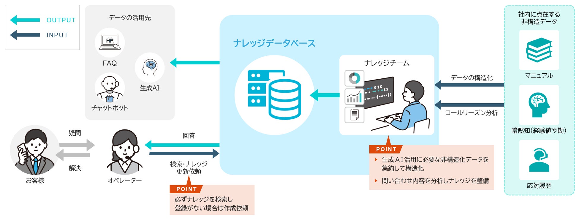 本サービスでは、コンタクトセンターに蓄積する応対履歴、マニュアル、FAQのほか、オペレーターの個人メモや暗黙知などの点在する、生成AI活用に必要不可欠な非構造化データを集約し、AIが理解しやすい検索可能なテキストデータとしてナレッジ化する仕組みをデザインします。