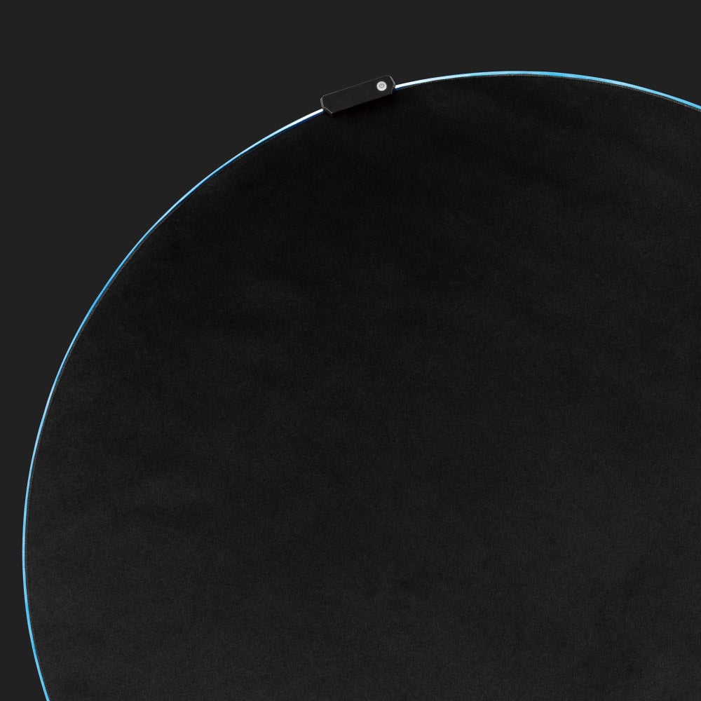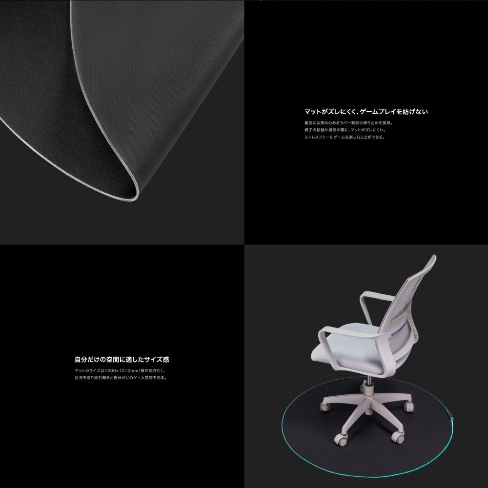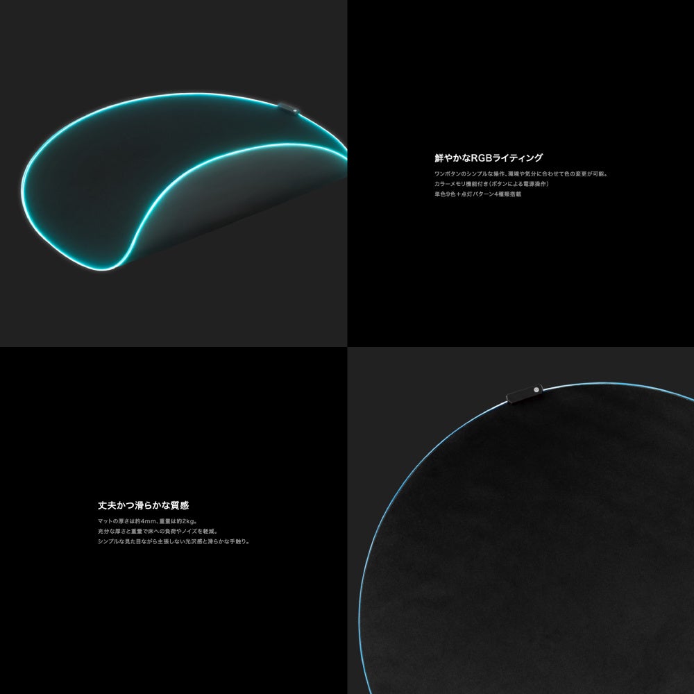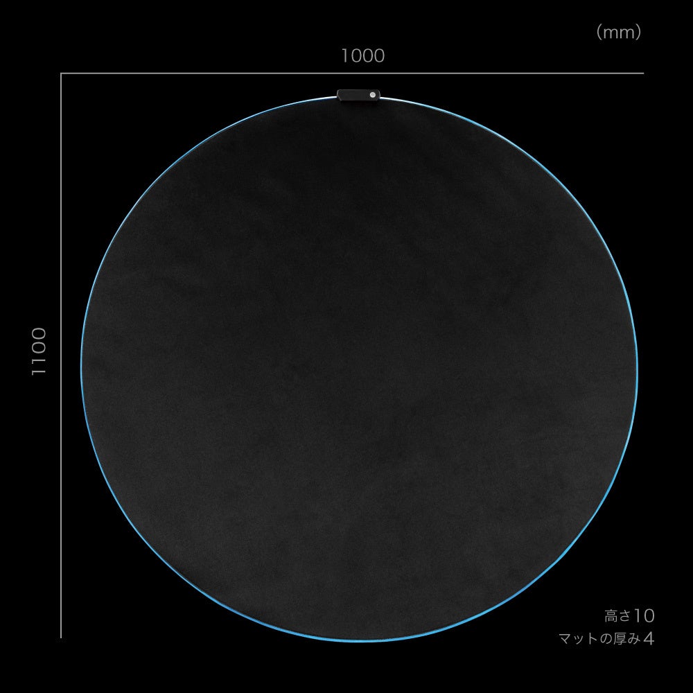 サイズは円型で幅100×奥行101×高さ0.4cm、約2kg。USBより給電。電源ボタンを入れると外周に内蔵されたLEDが点灯します。電源ボタンでLEDの点灯モード切り替えが可能。単色9色+点灯パターン4種類搭載。メモリー機能付きで電源を切る前の点灯モードを記録し再開時に同じモードで点灯します。厚さ4mmのマットで床への負担やノイズを軽減。裏面には滑り止め加工済。