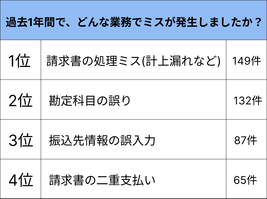 請求書の処理ミスの中でも、計上漏れは確認不足による単純な作業ミス、仕訳間違いは勘定科目の判断など知識や理解の不足によるミスといったように、性質の異なるミスが含まれていると考えられます。