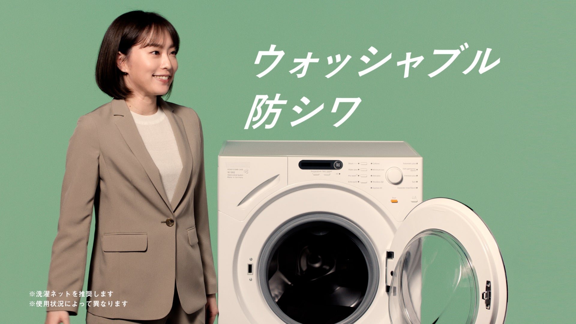 今回のCMでは、石川さんが新たに発売する「ゼロプレッシャースーツ」レディススタイルを着用し、ストレッチ性やウォッシャブル機能、価格(税込9,900円~)の魅力を発信する内容となっています。スーツをさっそうと着こなす三浦さん、きんに君さん、石川さんのキャラを活かした軽妙なトークと笑いありのCMとなっております。