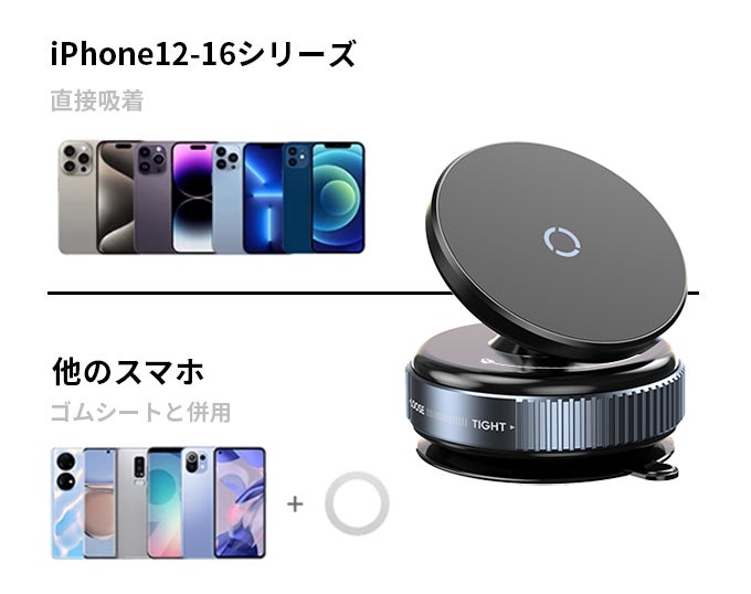 マグネットと真空式の2WAY吸着機能を備えたスマホホルダー。ワンタッチで簡単に取り付け・取り外しができ、車内や家庭、オフィス、アウトドアなど多用途で大活躍します。
