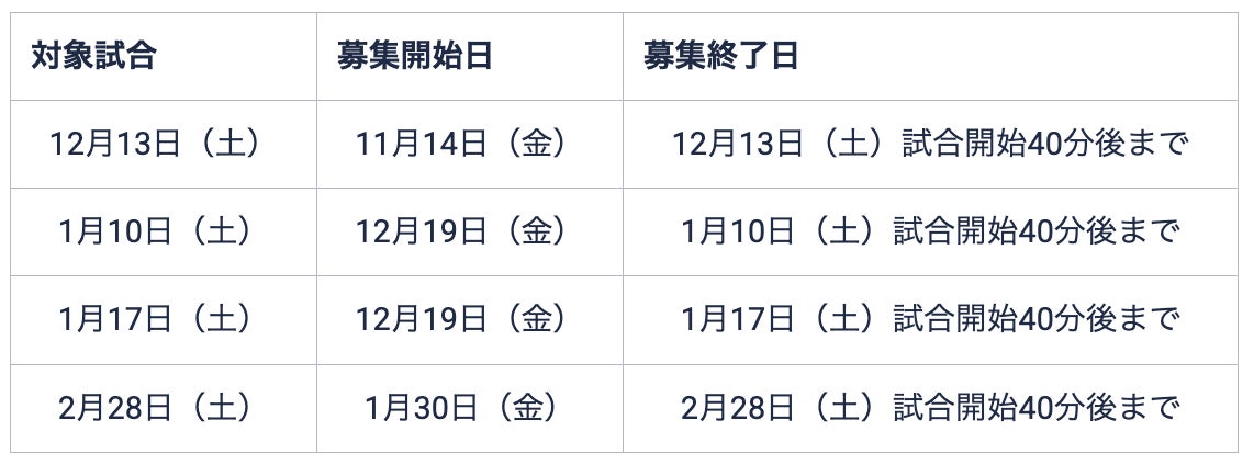 ・チケットのお申し込みは、各試合の申込開始日より試合開始から40分後までとなります。