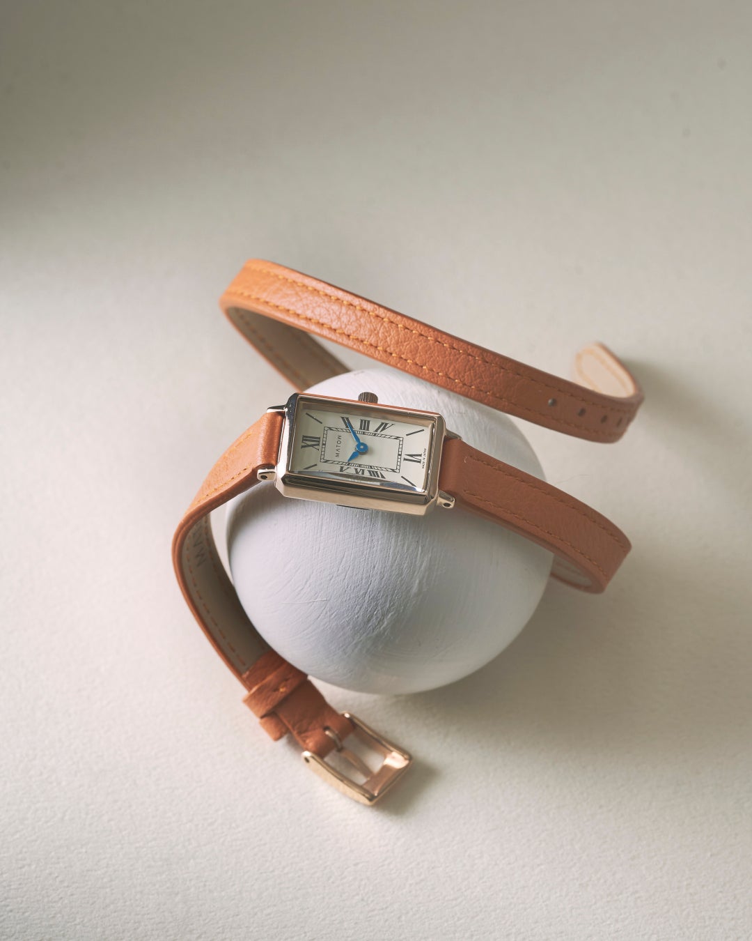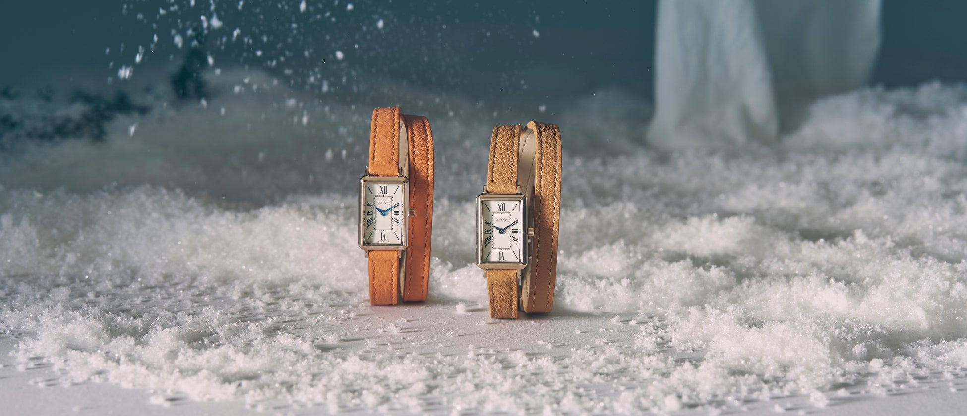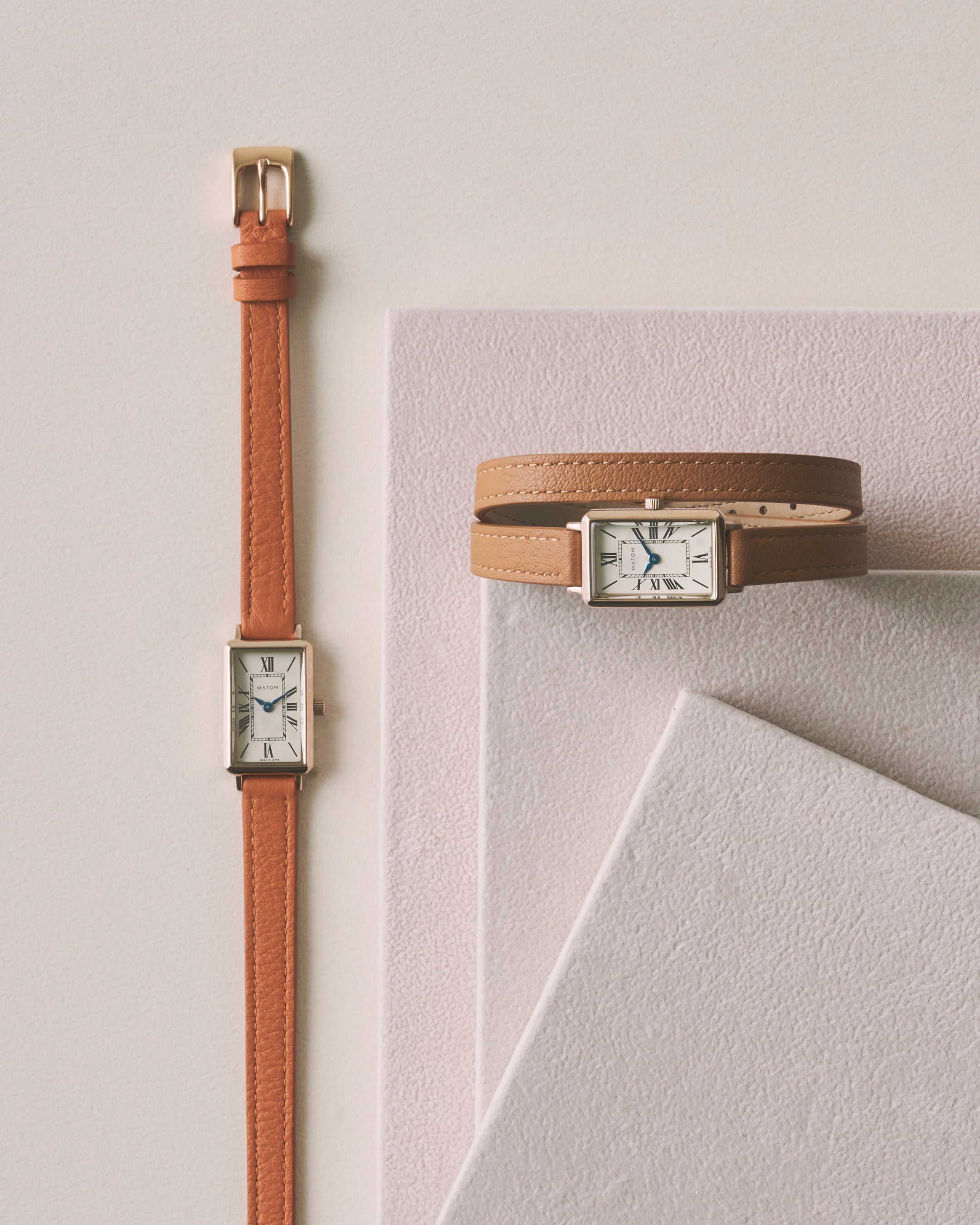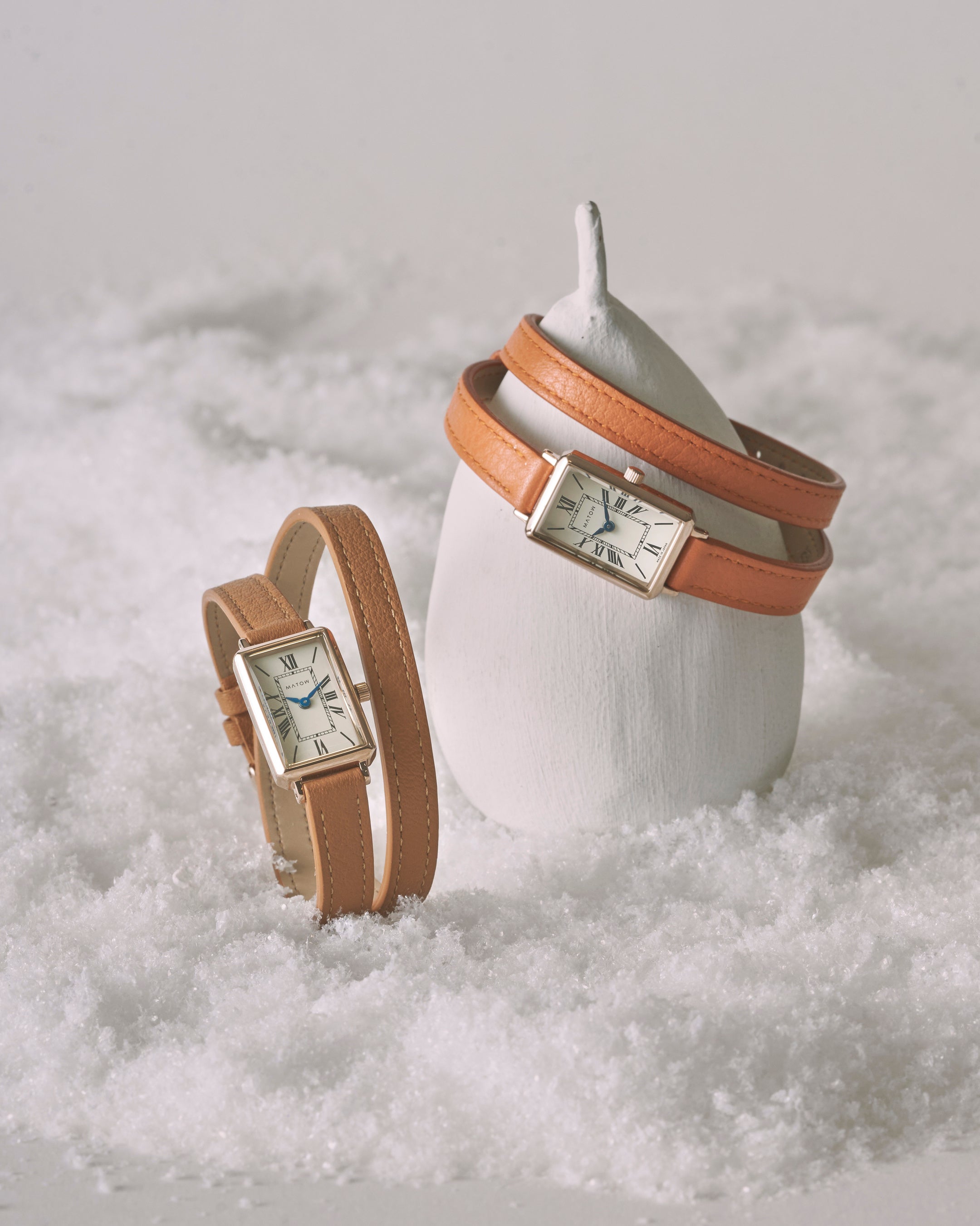 小ぶりなスクエアケース(29mm×19mm)は同じ佇まいのまま、素材の変化が“新しい表情”を生み出しました。細くしなやかなレザーが二重に重なることで、一本の線では生まれない“奥行き”と“動き”が腕元に生まれ、その重なりが月が描く静かな流れのような優雅さを添えます。柔らかなラインが腕元に自然な広がりを生み、アクセサリーのような軽やかさで日常を彩ります。光と影の調和が生む、月華の世界観。クラシカルなローマ数字、ミニマルなフェイス。それらが二重レザーの質感と重なり合い、“線の美しさ”と“余韻”をより際立たせます。レザーがつくる柔らかな影、ケースが放つ控えめな光。そのコントラストが、ツキコレクションが描いてきた静かな美の世界観をより豊かに広げていきます。