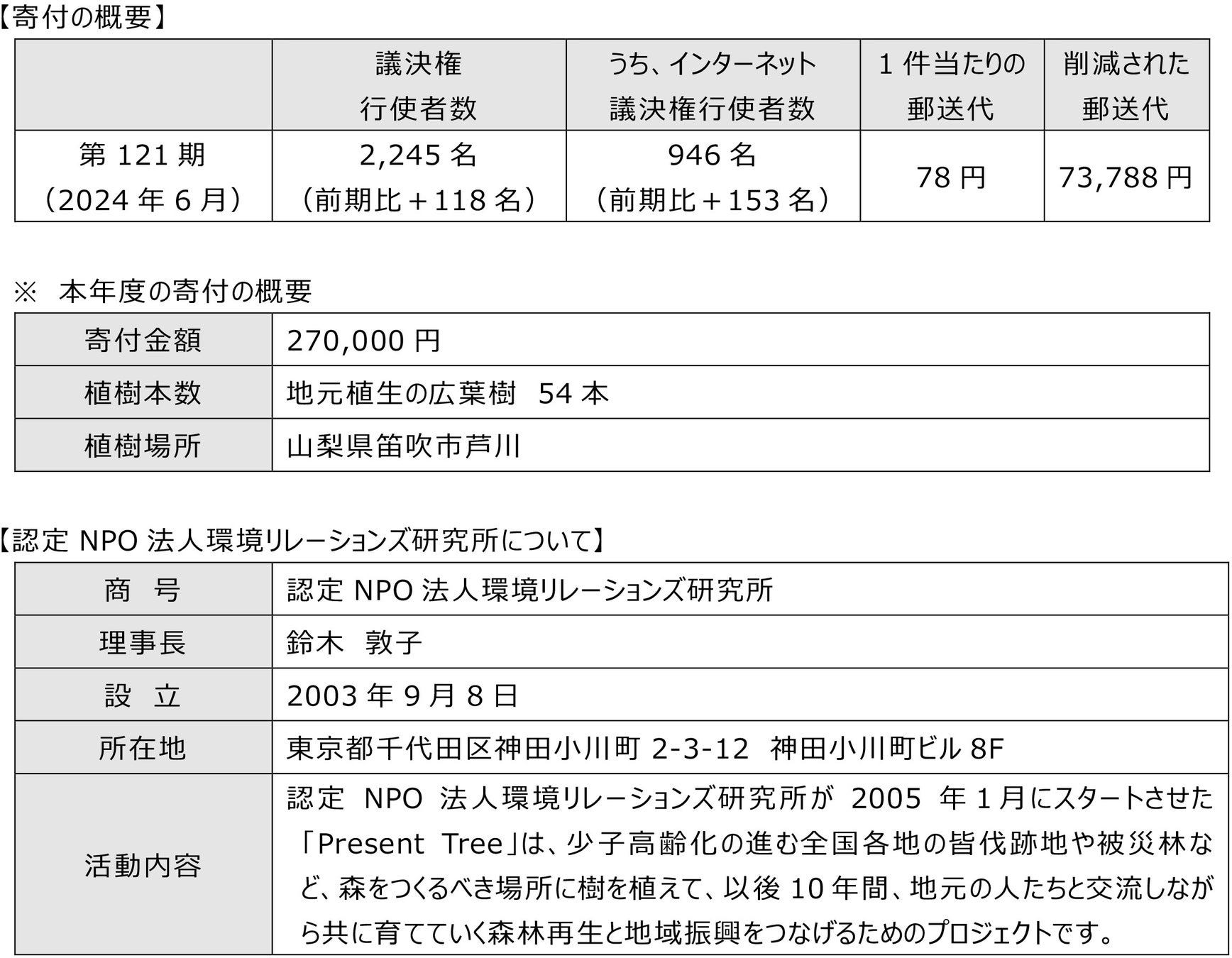 株式会社山梨中央銀行(頭取 古屋 賀章)は、2024年6月25日開催の第121期定時株主総会における議決権のインターネット行使により削減された郵送代相当額等を、地域の植樹活動を行う認定NPO法人環境リレーションズ研究所に寄付いたしました。