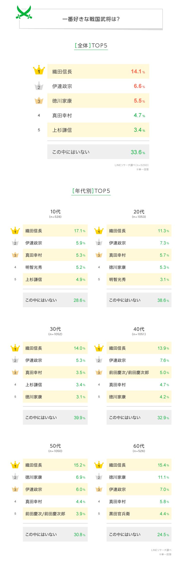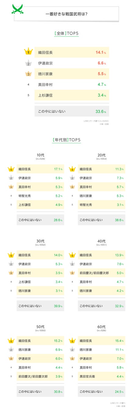 LINEリサーチ、全国の10代~60代の男女を対象に、一番好きな戦国武将に関する調査を実施