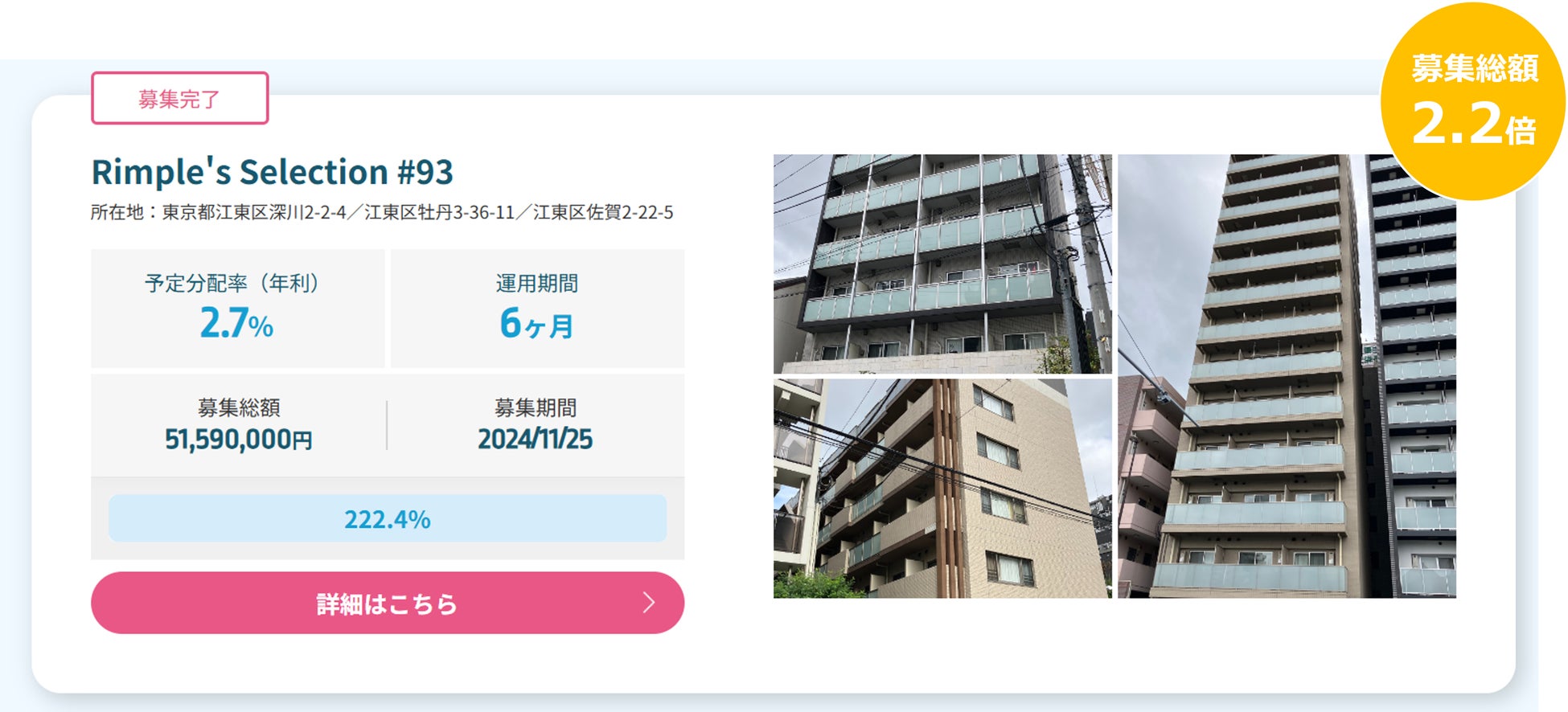 プロパティエージェントの展開する不動産クラウドファンディングRimple’s Selection#93募集総額222.4%の1.14億円の応募