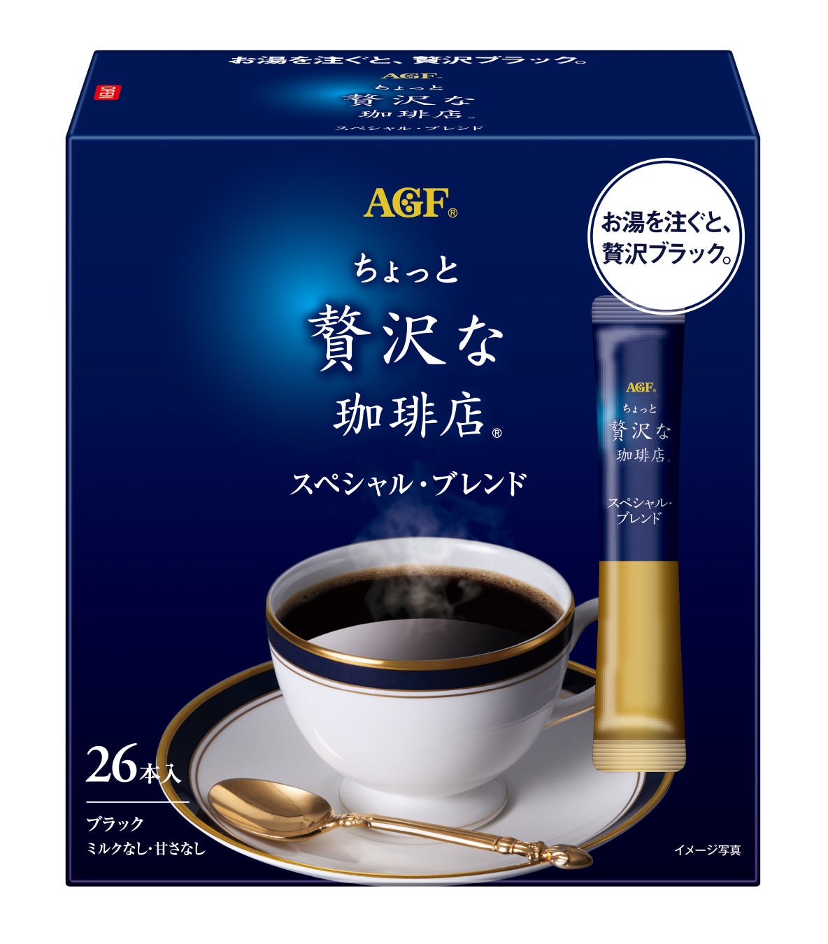 「ちょっと贅沢な珈琲店®」スティックは、お湯を注ぐだけで、珈琲店のような本格的な味わいと香りをどこでも手軽に愉しめるスティックタイプのインスタントコーヒーです。スペシャル・ブレンド、ブラックインボックス®、マスターこだわりのアソート、産地アソートなどの多様な商品を展開し、手軽にブラックコーヒーが愉しめるパーソナルタイプのインスタントコーヒーです。