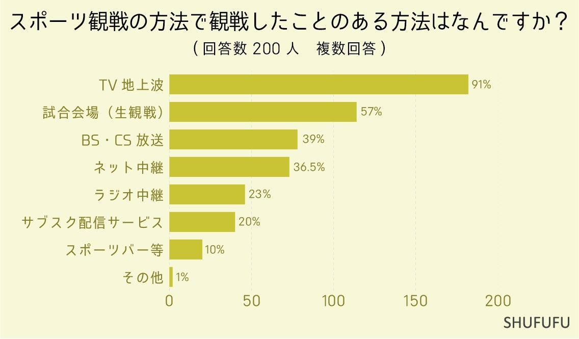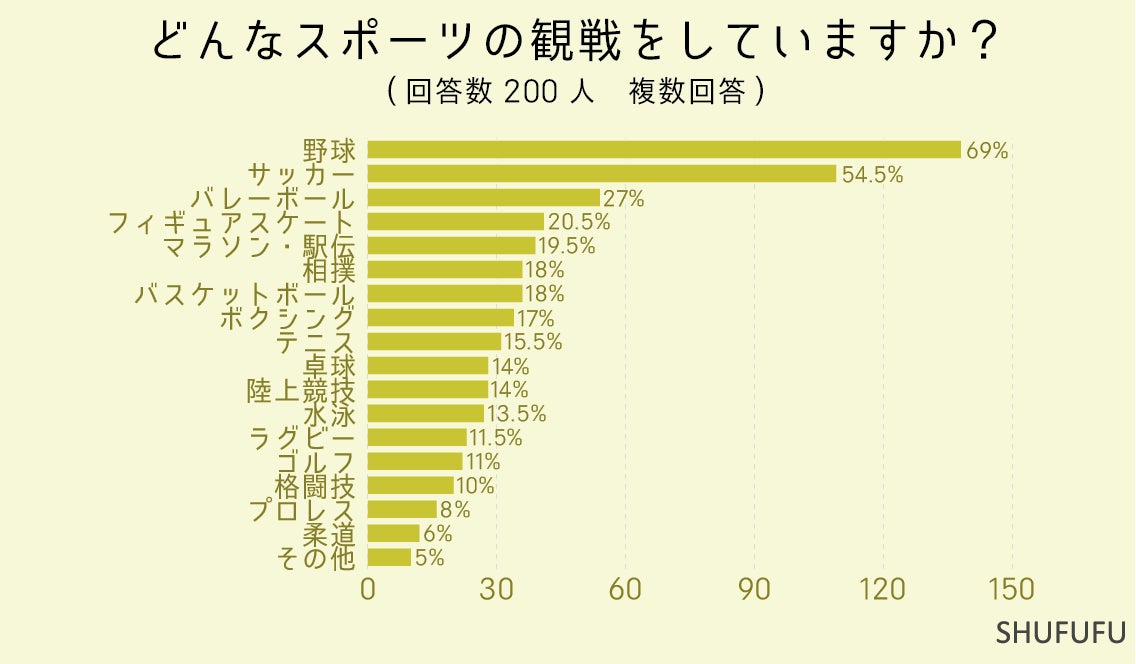 (観戦方法を問わず)どんなスポーツの観戦をしているかに関しては1位「野球(69%)」、2位「サッカー(54.5%)」でした。TV地上波での放映機会が多いスポーツが上位に見られます。
