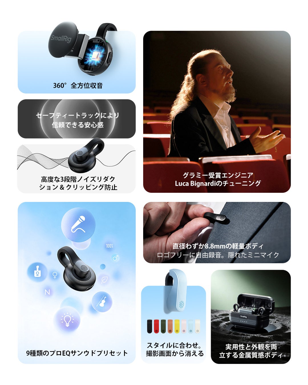SmallRig Japan株式会社(以下SmallRig)はS70ワイヤレスマイクロホンを公式ストアで販売開始いたします。世界的なエンジニアであるLuca Bignardiによる精密な音質チューニングです。長年の経験から導き出した9種類の専用EQプリセットを搭載。ボーカルから楽器、環境音まで、シーンや素材に応じた最適な音響特性をワンタッチで実現し、煩雑な後期修正の負担を軽減します。さらに、ロゴをあえて排除したミニマルなデザインは、画面を邪魔することなく、視覚的にもクリエイティブな作業に集中できる環境を提供します。