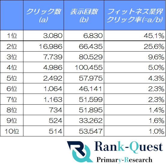 【SEO対策】で検索結果1位を獲得した(注1)ランクエスト(https://rank-quest.jp/column/column/how-to-seo/ )は、2025年4月にフィットネス業界のクライアントサイトを対象とした「検索順位ごとのクリック率(CTR)」の調査を実施しました。
