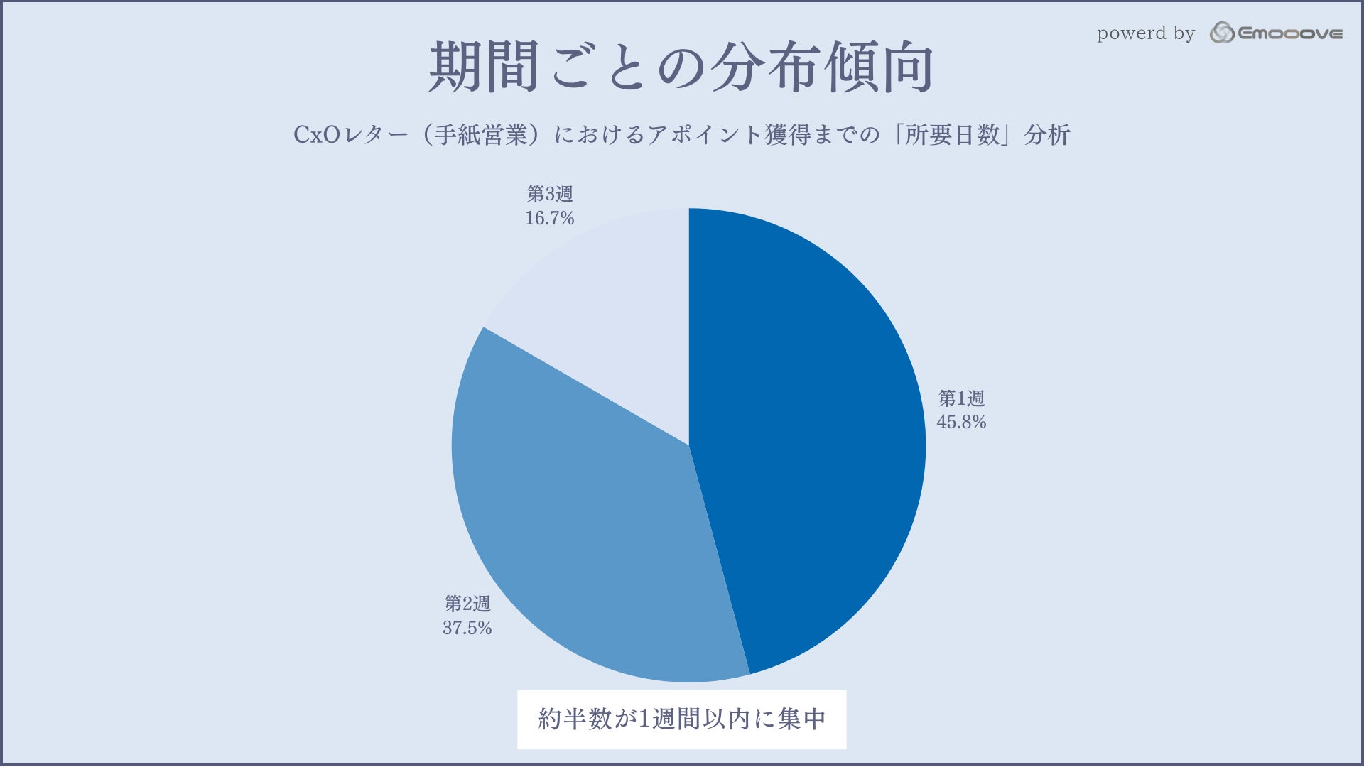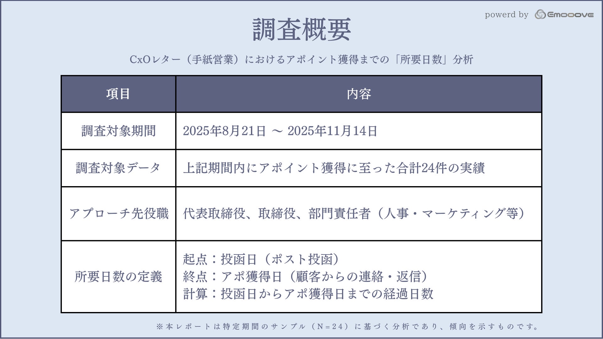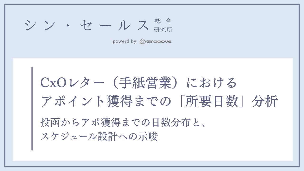 新時代の営業手法を提案する株式会社Emooove(本社:東京都品川区、代表取締役CEO:藤澤諒一)は、同社が運営するオウンドメディア「シン・セールス総合研究所」において、決裁者向けCxOレター(手紙営業)における「アポイント獲得までの所要日数」に関する分析レポートを公開しました。