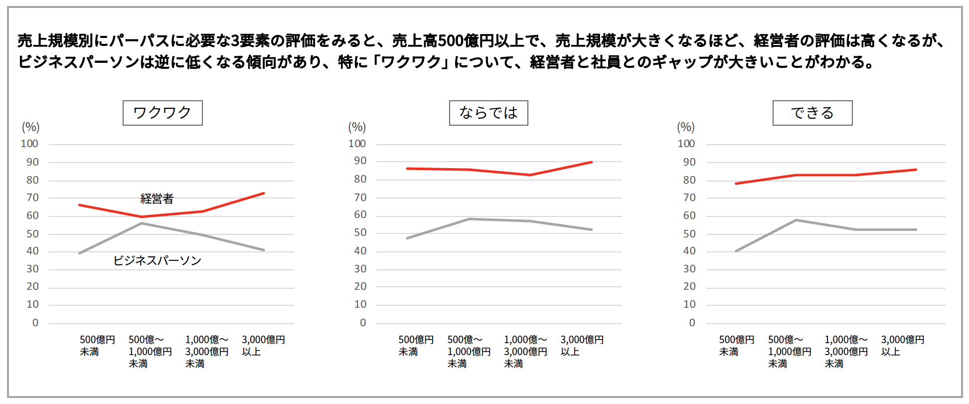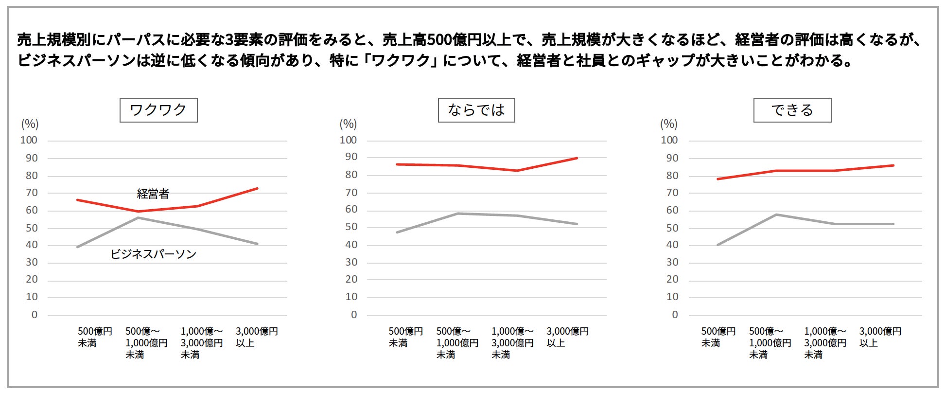 「パーパス」に必要な3つの要素(ワクワク/ならでは/できる)における経営者と社員の認識の大きなギャップが明らかになりました。3つの要素のうち「ワクワク」は他の2つの要素と比較すると、経営者ならびに社員ともに低水準にあり、全体として「ワクワク」するの要素の向上が課題といえます。また、「ワクワク」の要素は、企業の売上規模が大きくなるほど、両者のギャップが拡大していることが確認されました。多くの企業で「パーパス」に必要な3要素のうちの「ワクワク」する要素の強化が課題であることを考慮すると、「パーパス経営」におけるエモーショナルなドライバーとして「ブランド」の果たす役割が期待されます。
