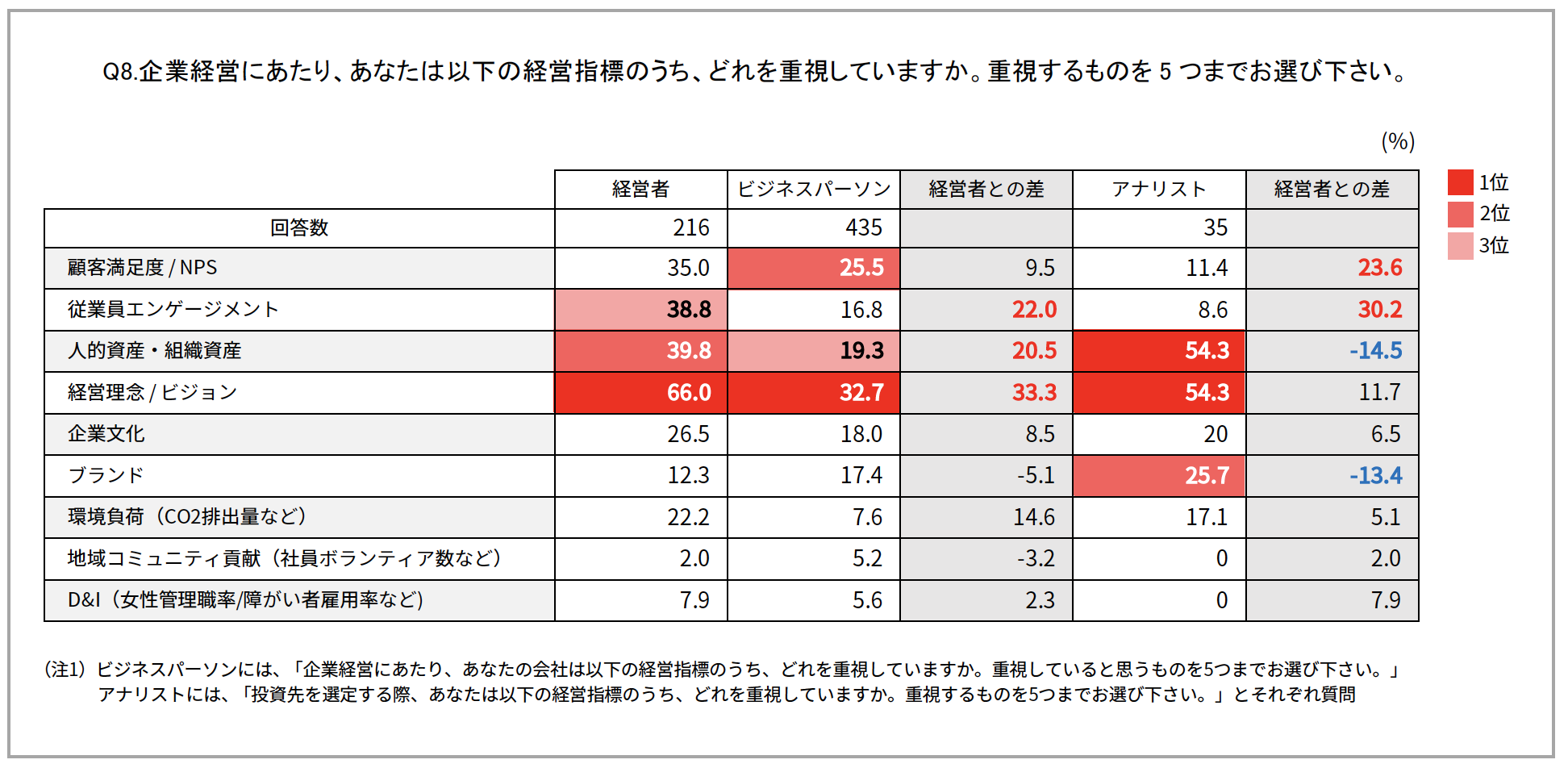 重要視する経営指標として、アナリストは「投資効率」や「キャッシュフロー」といった財務指標だけでなく、「人的資産・組織資産」や「経営理念・ビジョン」などの「未財務」を重視しています。とくに「ブランド」の重要度は「経営者」よりも高い傾向がみられました。