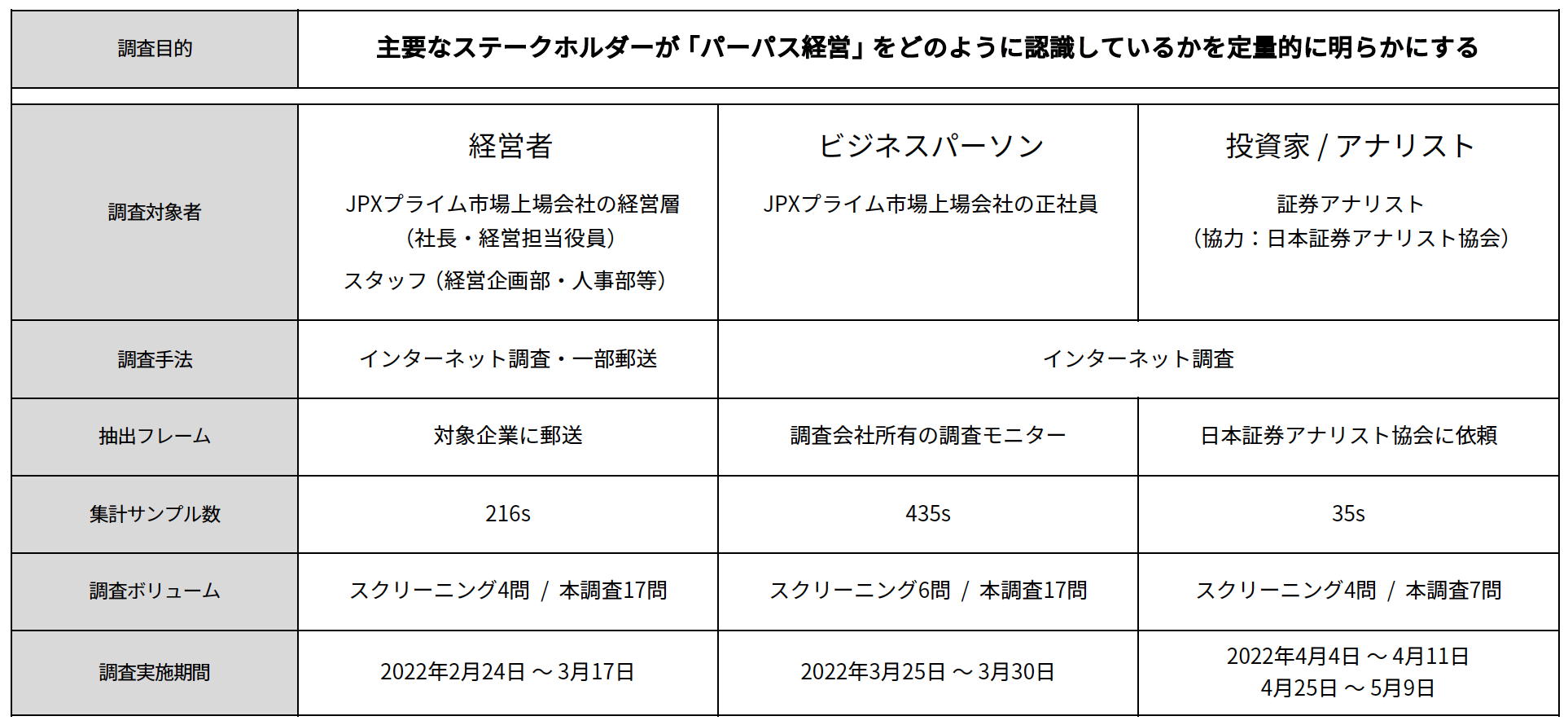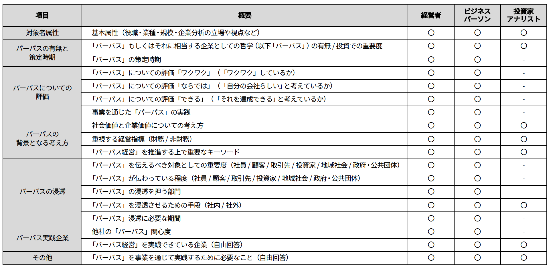 今回の調査で「パーパス経営」に関して、我が国の経営層・ビジネスパーソン・投資家/アナリストの三者間に、その認識に大きな乖離があることが明らかになりました。経営者と社員の認識のギャップ、パーパスに求められる3つの要素(ワクワク/ならでは/できる)のうち「ワクワク」する要素の欠落、投資家/アナリストから「具体的な行動と仕組みづくり」の要請。現在の我が国企業の「パーパス経営」を取り巻くこれらのファクトは、パーパスを起点とする企業経営・事業活動に対して多くの示唆を提示しています。