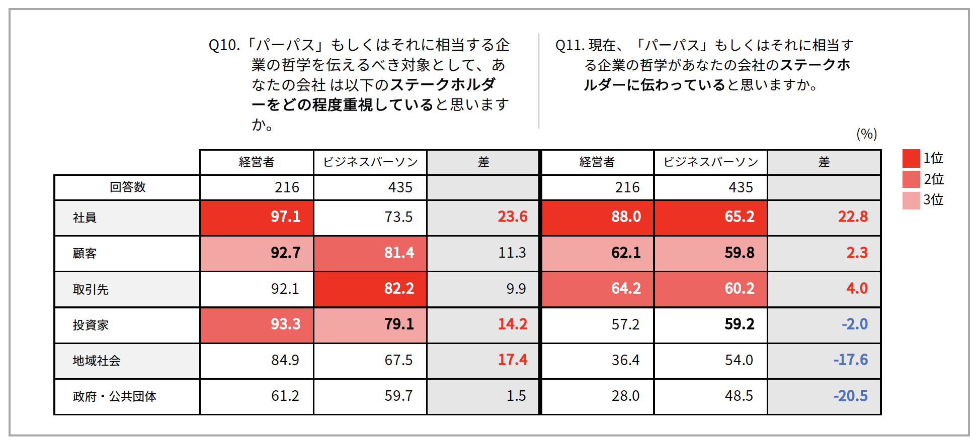 「パーパス経営」に対して、「経営者」と「ビジネスパーソン」(社員)との間に極めて大きな認識のギャップがあることが明らかになりました。経営者は、その哲学を伝えるべき最も重要なステークホルダーとして「社員」をあげ、「社員」にも「パーパス」が伝わっていると認識していますが、社員は、いずれにおいても、そうとらえていない状況にあることが明らかで、両者の認識に大きなギャップが存在しています。