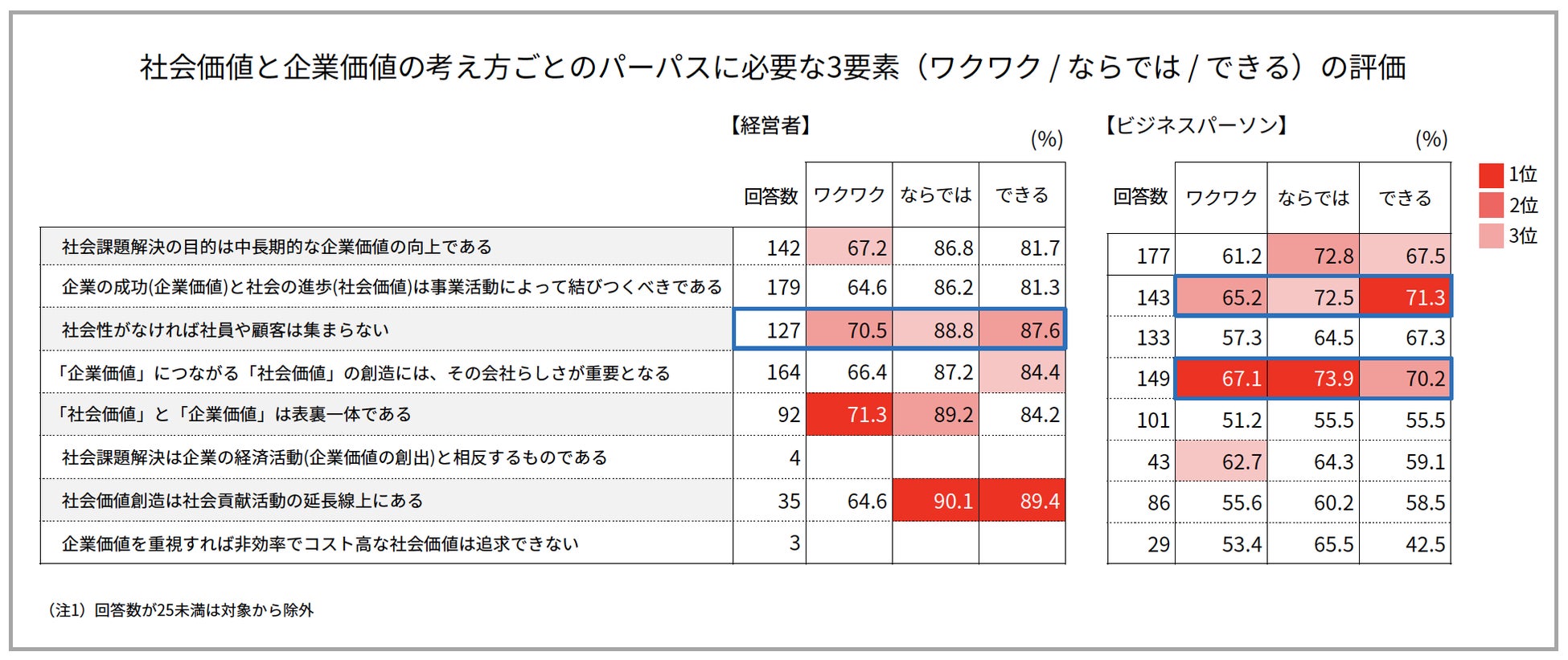 また、「『企業価値』につながる『社会価値』の創造には、その会社らしさが重要となる」と考えるビジネスパーソンは、パーパスに必要な3要素(ワクワク/ならでは/できる)の評価が高く、社会価値を経済価値に転換し、企業価値を創造するためには、「らしさ」すなわちブランドの活用が重要といえます。