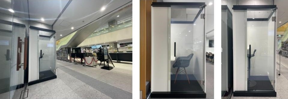 扉のスモークをオン・オフにできるスマートガラス機能で、視覚的な情報漏洩を防止。市民が個人情報を記入する際のブースとしても利用が可能に。