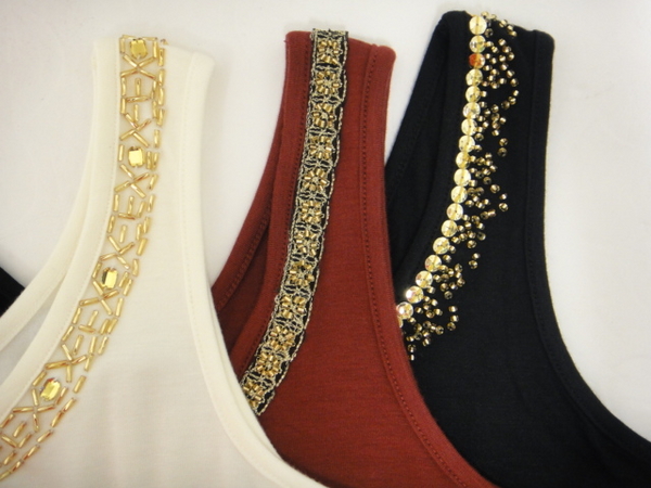 今回のアイテムは、襟ぐりのビーズがポイントです。3種類の異なるパターンから、お好みのデザインをお選びいただけます。ニットの首元からさりげなくビーズを見せて着ると、おしゃれ度UP!
