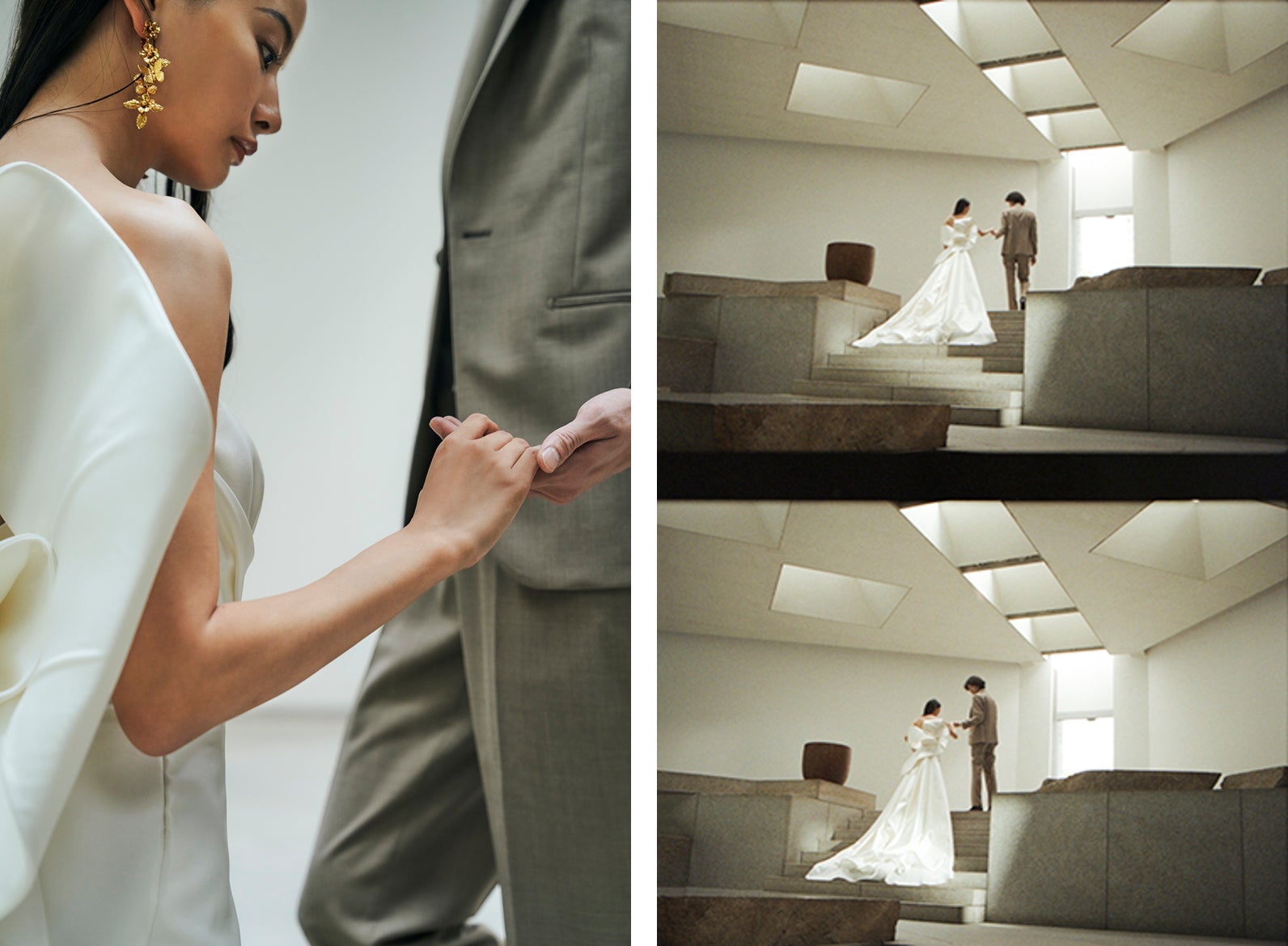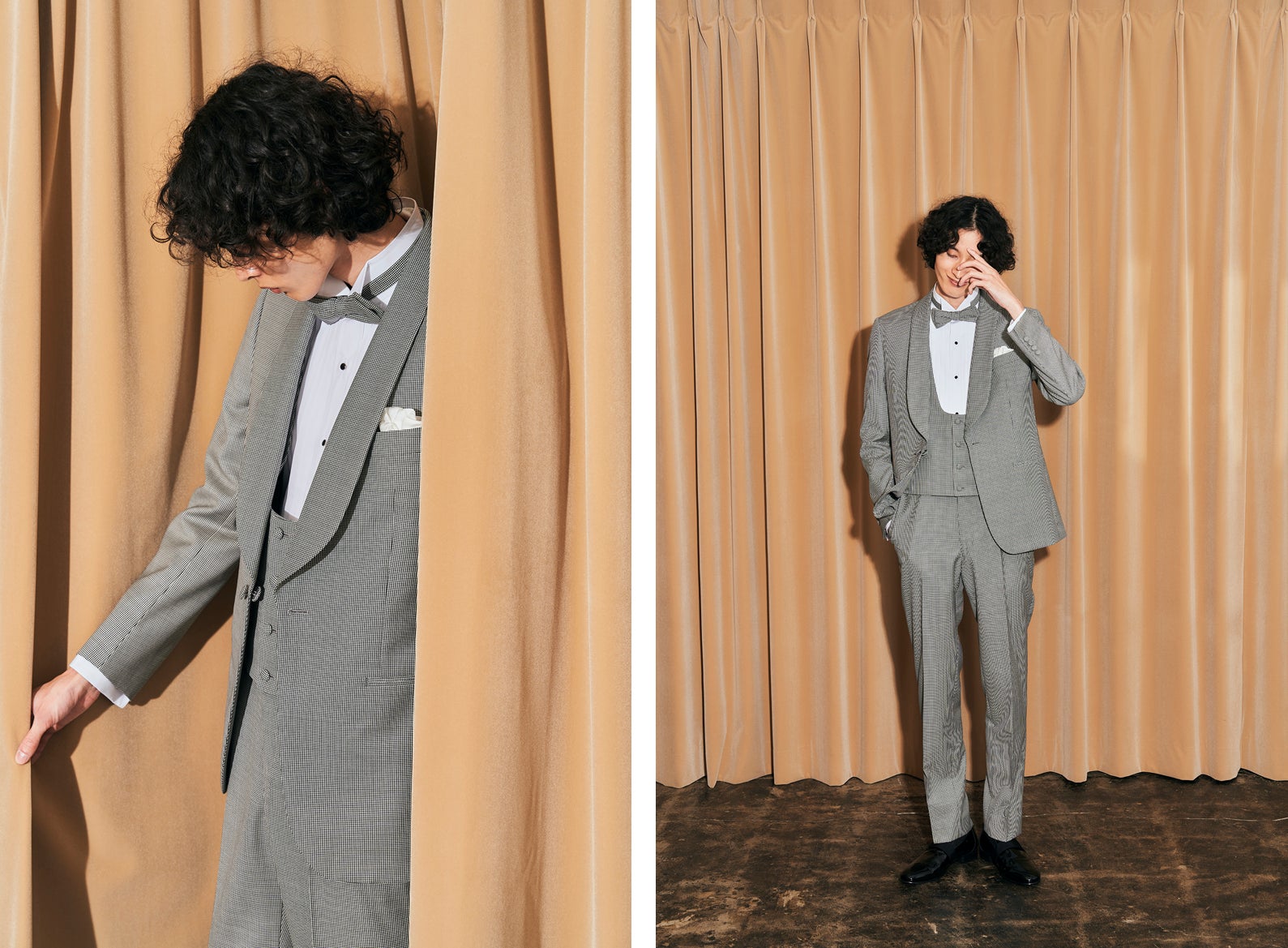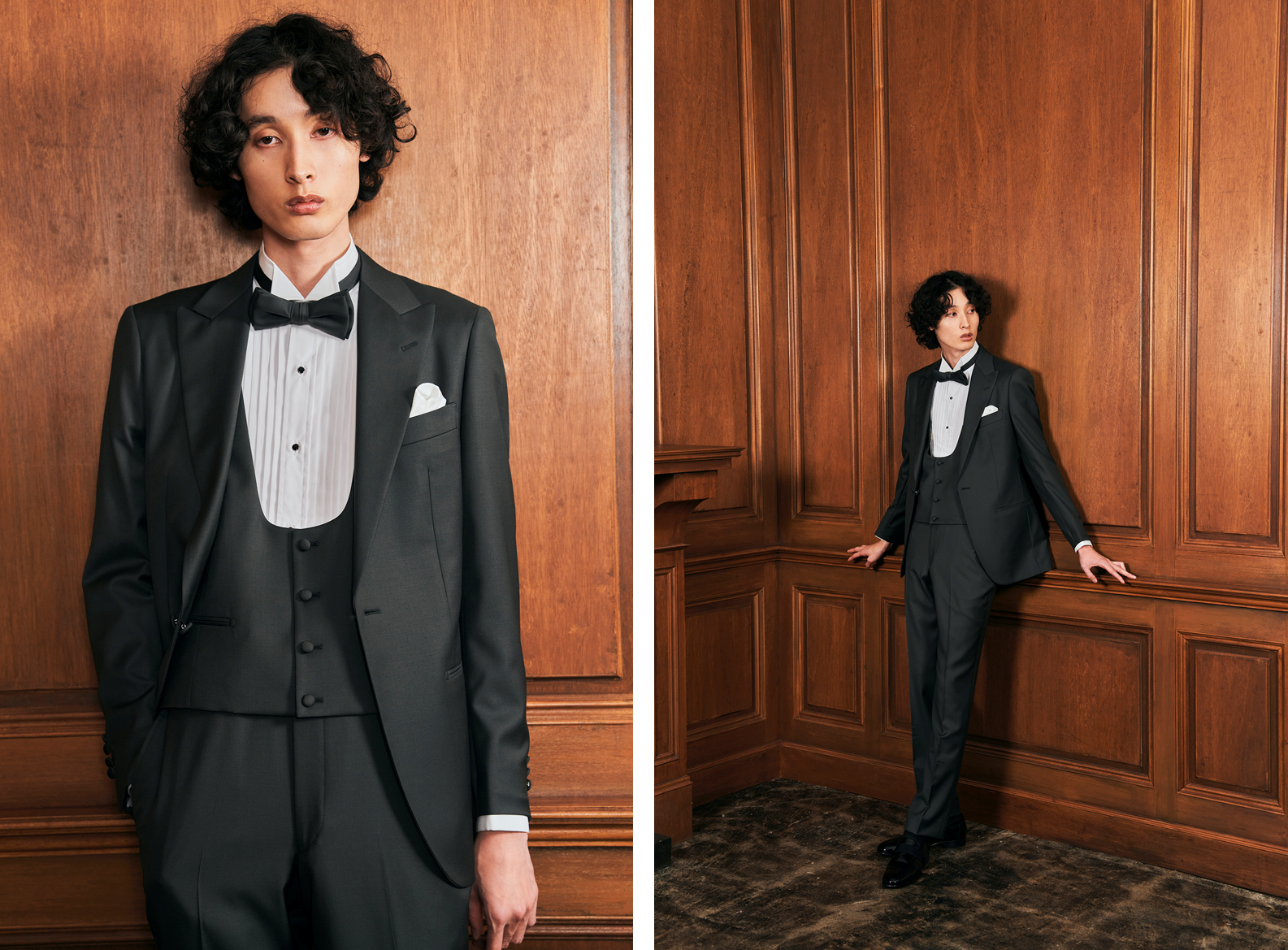 そして、第3弾となる今回は、コラボ3周年記念企画として、「ドレスを際立てるタキシード」をコンセプトとする6モデルが登場します。ユナイテッドアローズのパターン(原型)で作られたタキシードを、シンプルなデザインの中に、上質な素材使いで美しさを追求。視線が集まる襟ラペルは印象が変わる「ショールカラー」「ピークドラベル」をややシャープに仕上げることで、現代的な着やすさを生みだしました。