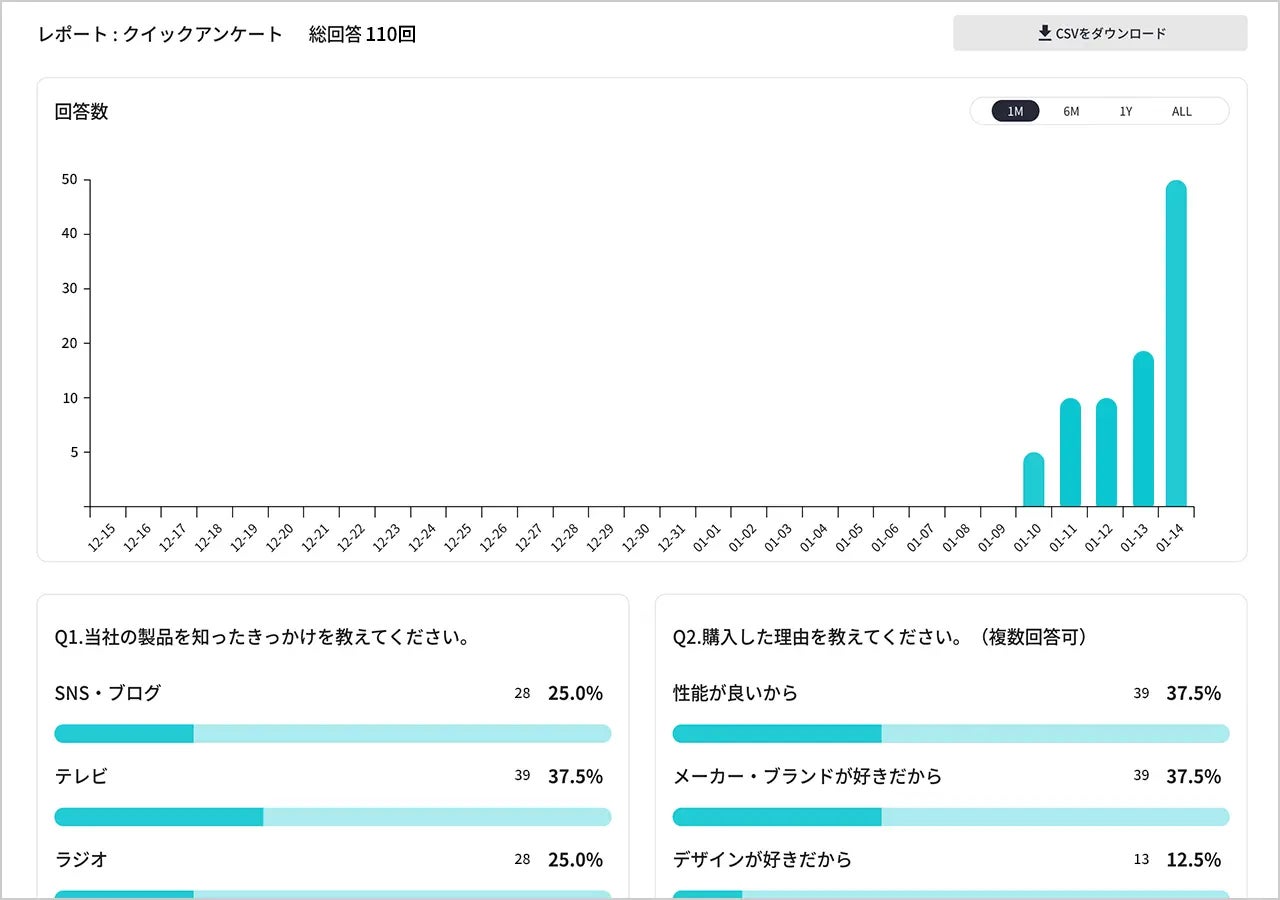 集計結果はWebサイトでの閲覧だけでなく、PDF保存やCSVデータのダウンロードもできデータ共有に便利に活用できます。クロス集計機能により、収集した回答データを年齢や地域といった項目と組み合わせて分析ができ、より深くフォーム回答者のインサイトを得ることでマーケティング施策に役立てることができます。