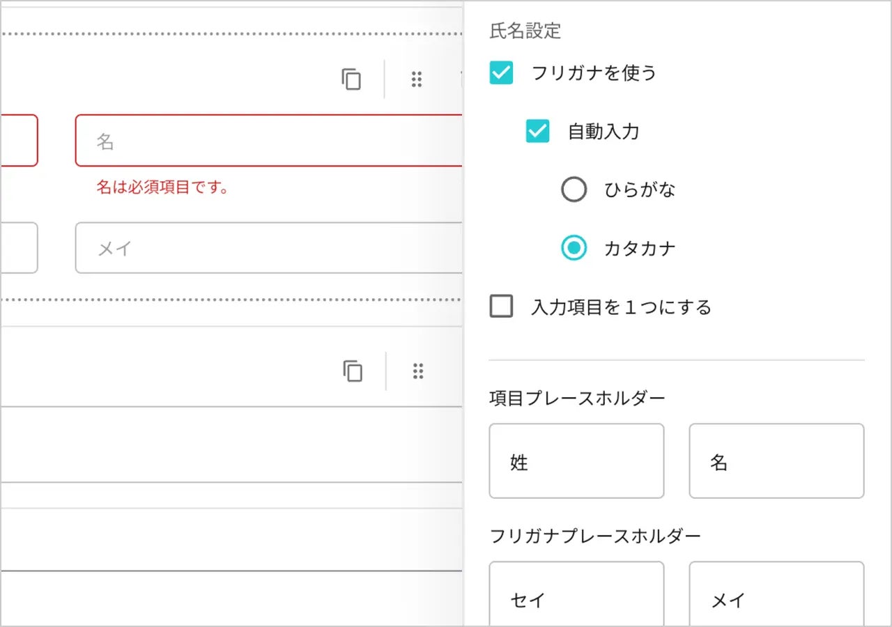ふりがな自動補完や郵便番号からの住所自動入力機能を搭載し、フォーム回答者の手間を軽減。スムーズな入力体験を提供することで、フォーム入力時の離脱を防ぎます。また、ラベルとフォーム項目を横並びに配置する2カラムのレイアウトも利用でき、フォーム全体の高さを抑え、CVボタンまでの距離を最短で設置することができます。