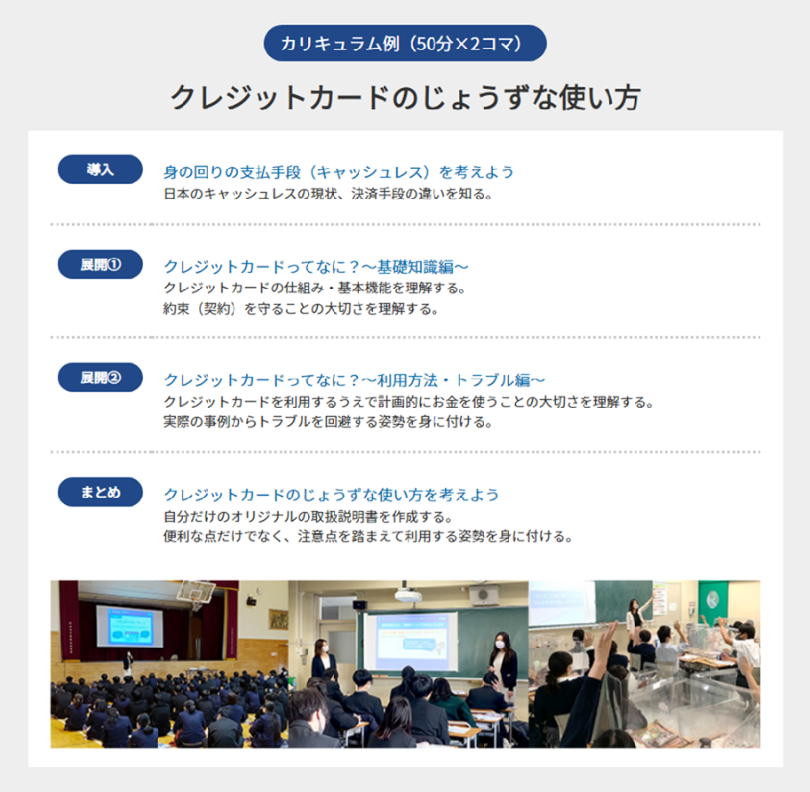 ■「クレジットの基礎知識」や「キャッシュレスサービスの上手な使い方」など実社会に即した金融の仕組みを対話、ワークを通して学びます。