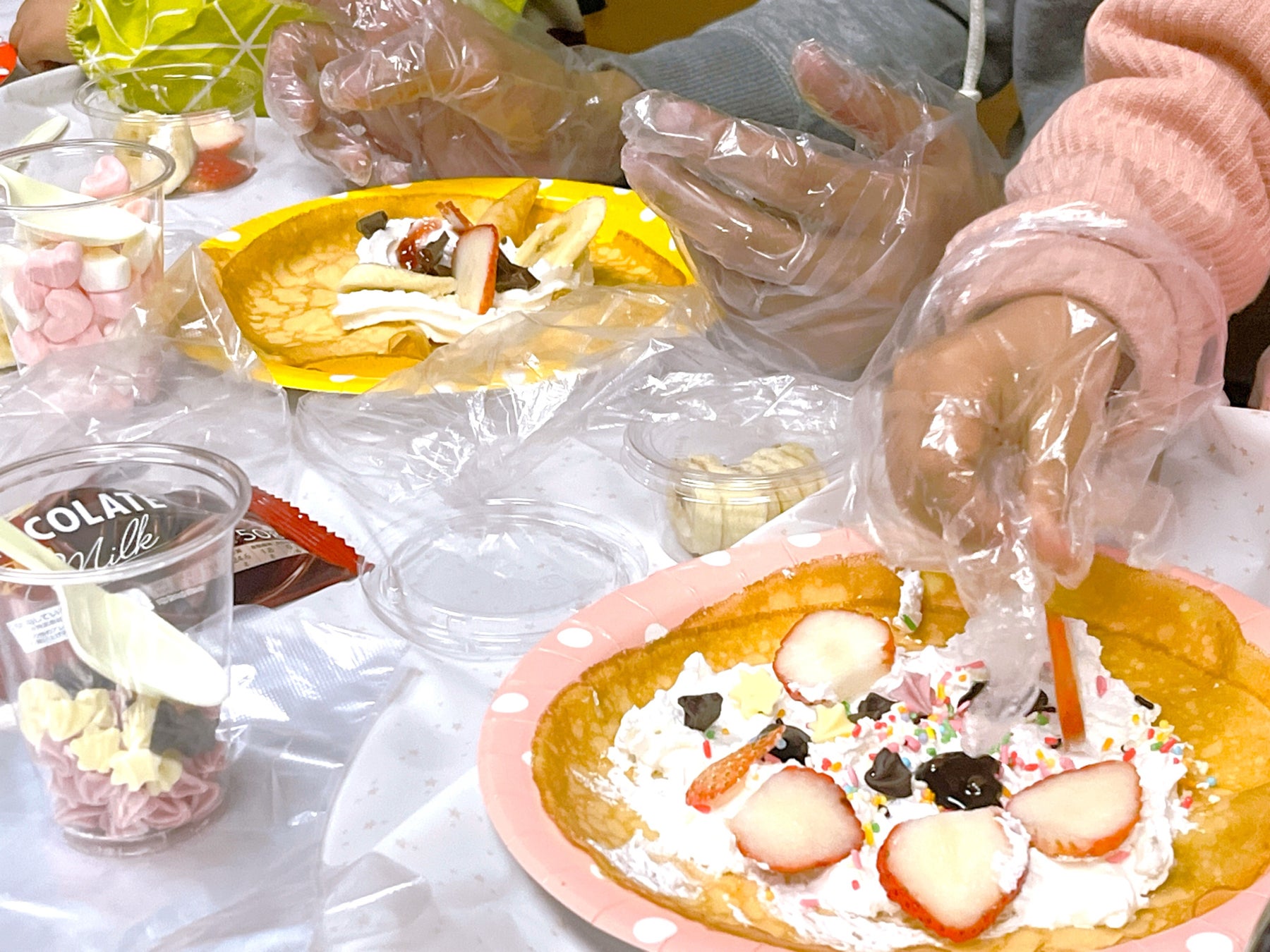 参加した子どもたちは生地の上にいちごやバナナ、チョコ、マシュマロなど好きな材料を自由に盛り付け、オリジナルのクレープづくりに挑戦。1つのテーブルに2~3家族が集まり、材料を譲り合ったりお話をしたりと、参加者同士が交流を深めました。