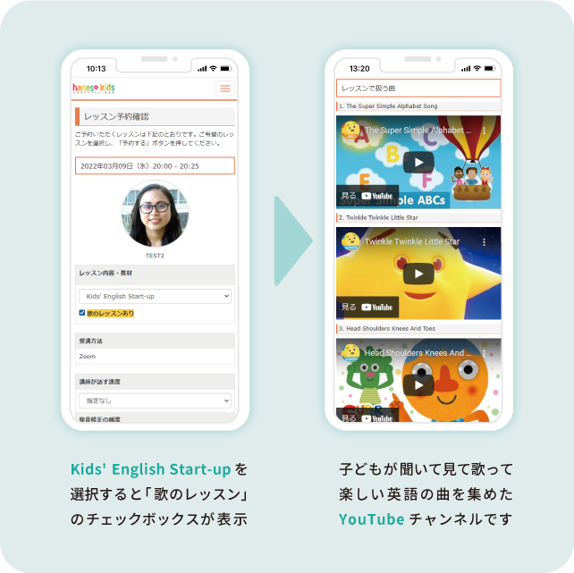 hanaso kids オリジナルテキスト"English Start-Up"をご予約いただく際に、「歌のレッスンあり」にチェックをつけていただくと、レッスン開始時と終了時にSuper Simple Songsを使った歌のレッスンを行います。