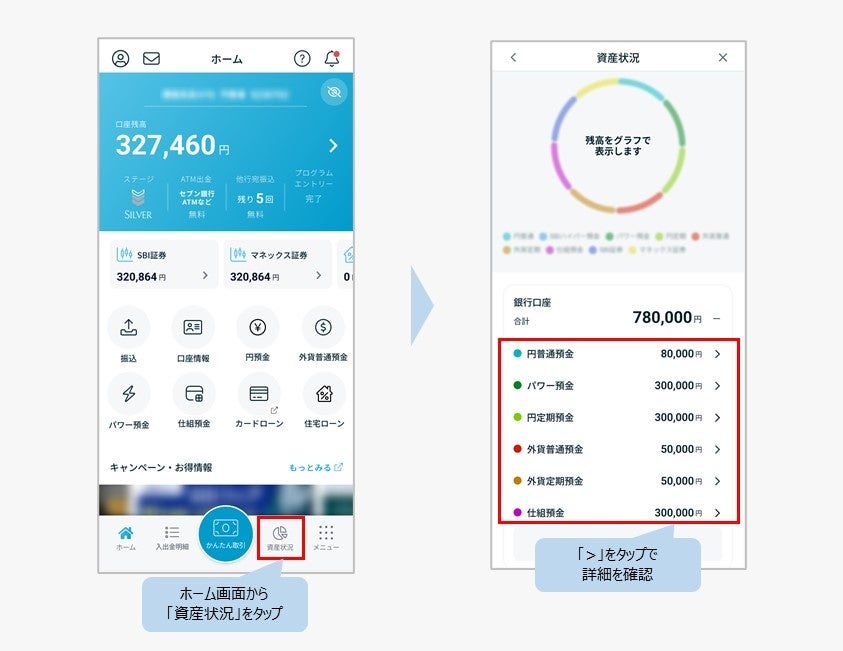 ■多くのお客さまよりご要望をいただいていた、各預金の保有状況の詳細が「資産状況」画面からご確認いただけるようになりました。